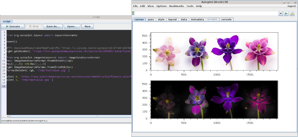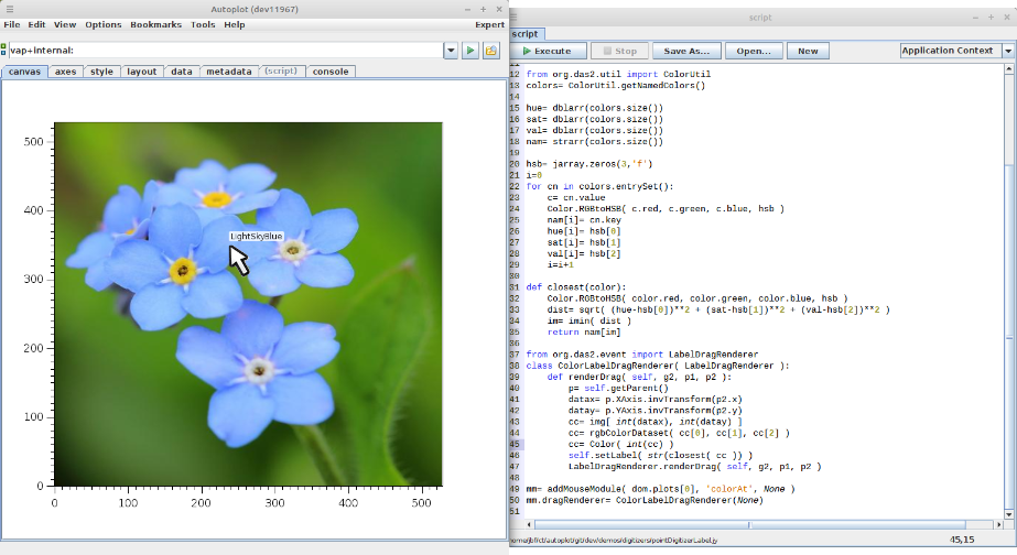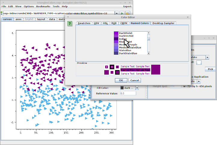 20150729a: A round of new features is coming with v2015b. Here rgbColorDataset is used to form the data for the colorScatter mode, and plot now accepts named parameters.
