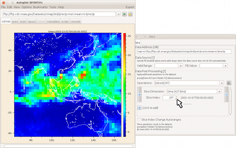 20150203a: Overplot of coastlines on rainfall NetCDF spectrogram, showing slice to scan through slices in time.