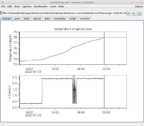 20200704a: Monitoring current used to heat a pool to a comfortable 78°F. Axis "reference" property marks "now" (the current time) and 78. Happy Fourth, Americans!