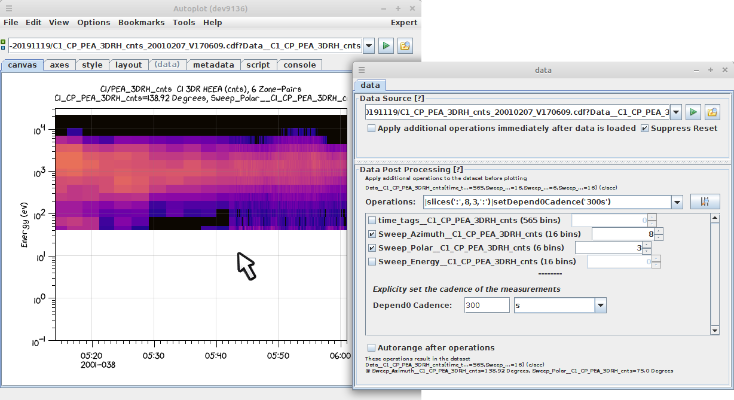 20191126a: Cluster/PEACE data shown with Sci-Py Plasma colorbar. The default colorbar to use can now be set in [menubar]->Edit->Options.