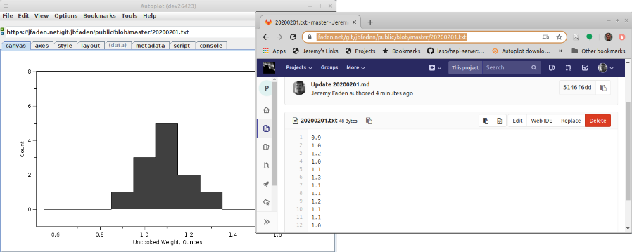 20200202a: Cookie weight is entered directly into GitLab file from a cell phone in the kitchen, then plotted the next day in Autoplot.