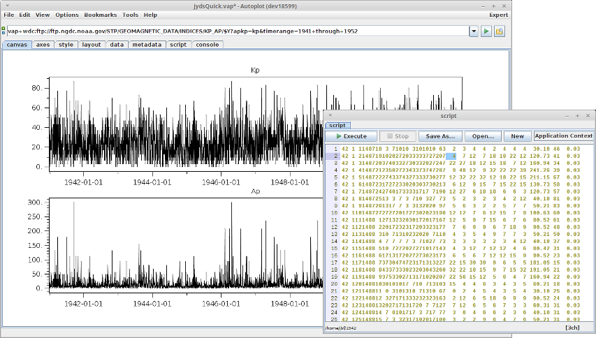 v2018a_3: vap+wdc prefix parses the World Data Center KP/AP files without mention of the .jyds script which reads the data files. The script editor is used to show one of the files.