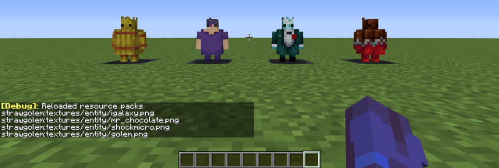 As before, we retrieve the MOD ID (strawgolem) and ENTITY ID (straw_golem) and create the config file in definitions/strawgolem/straw_golem.json. However, in this case the straw golem entity actually has several possible variants! We can see the identifiers for a few of these being displayed in the chat: