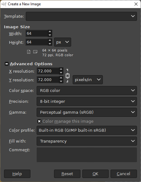 Next create a blank image that we can paste our selected area to. Selecting File>New... will bring up a box with some options. I recommnd setting the image dimensions to be 64px by 64px and 'Fill with' set to transparency. Select OK to create the image.