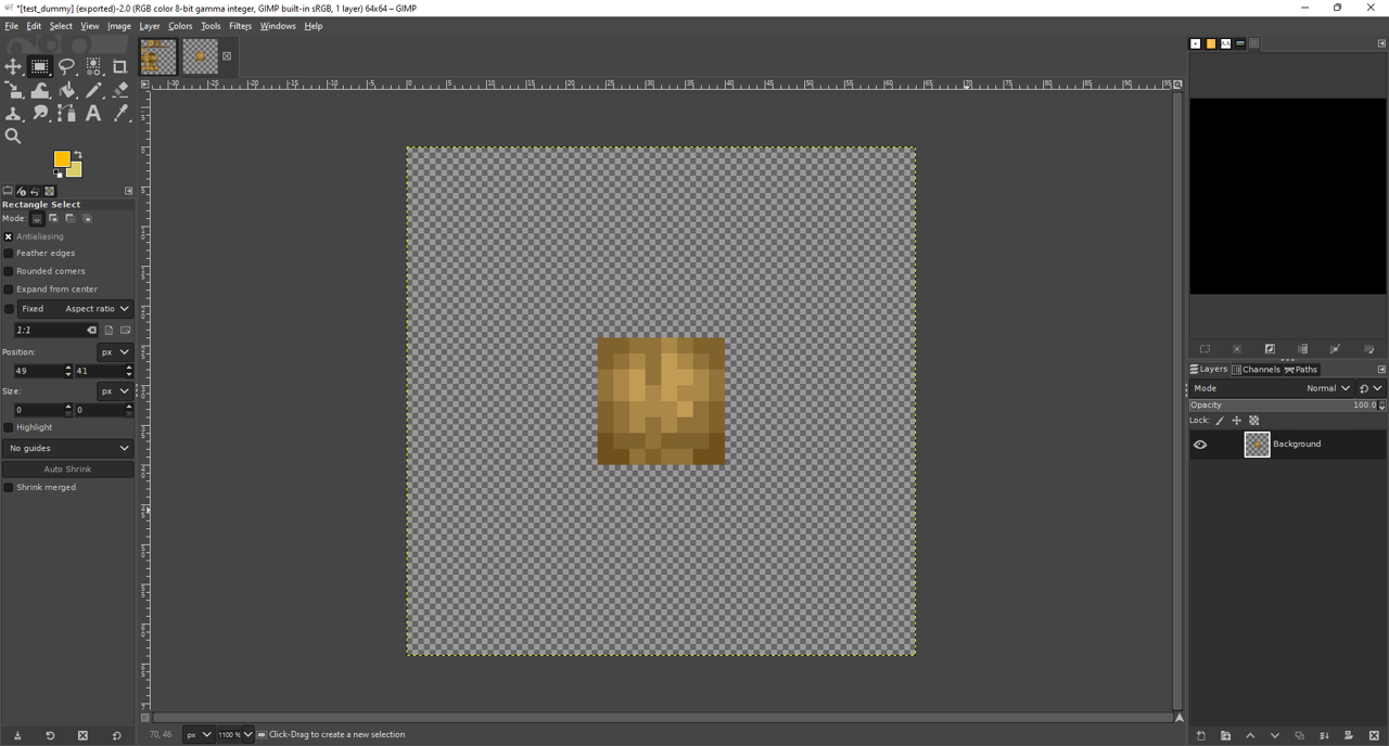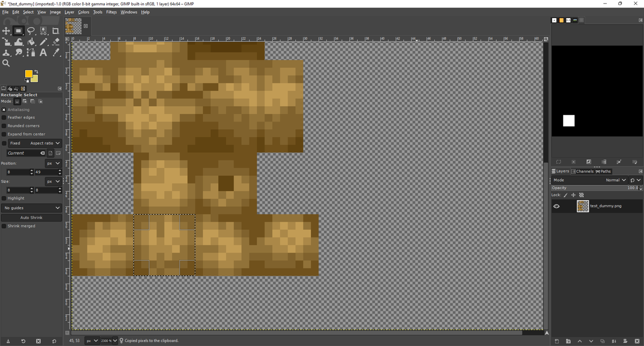 When you have done this, place the head in the centre of your image and export (Ctrl + e) the image to your sprites directory. I have named my sprite test_dummy.png.