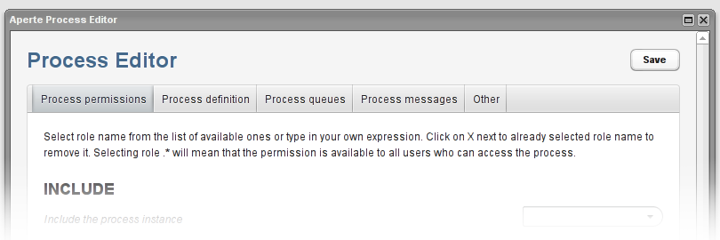 Aperte Process Editor is part of the Aperte Modeler Editor window. It's focused on providing functionality to edit those process parameters that are directly related to the Aperte Workflow runtime.