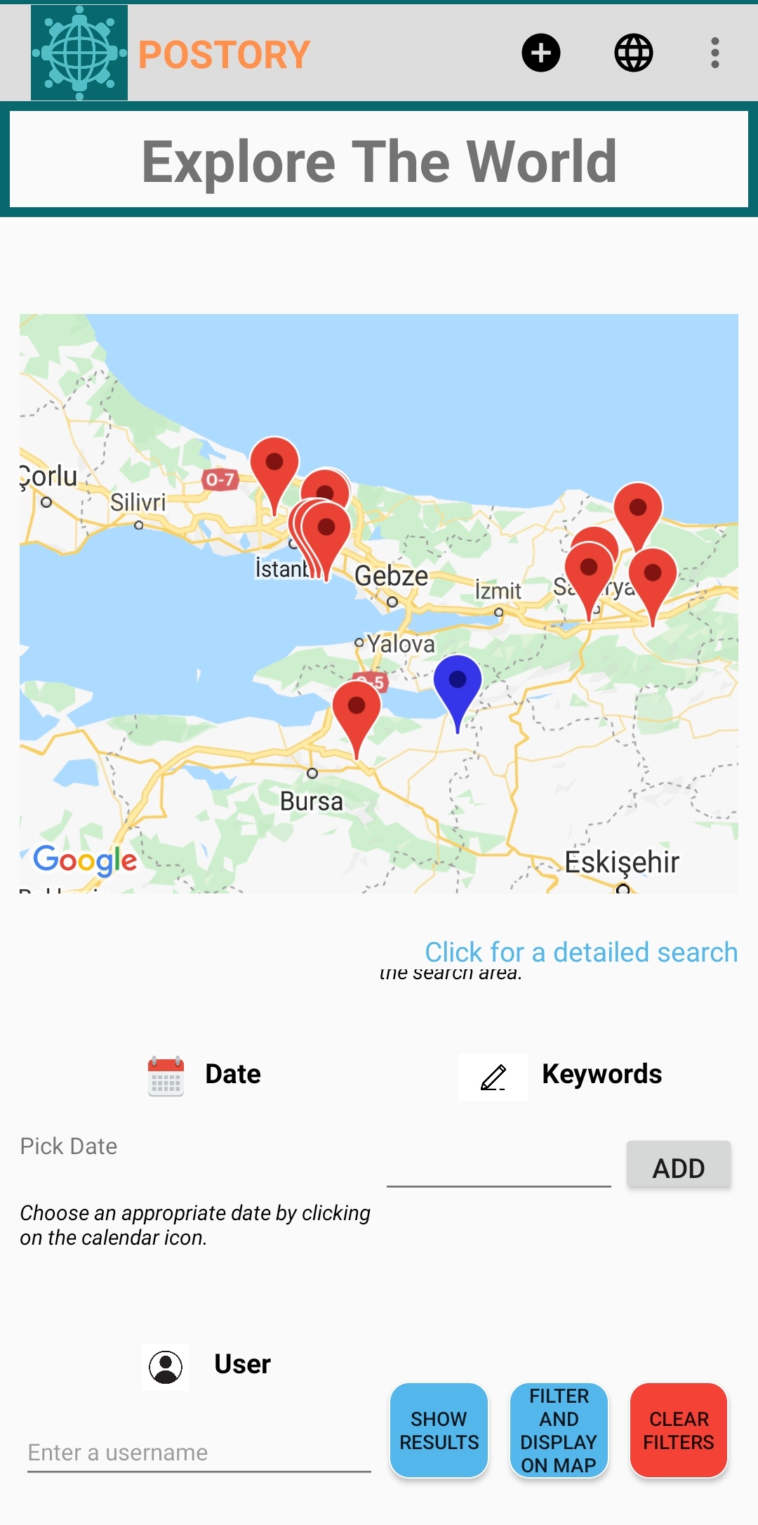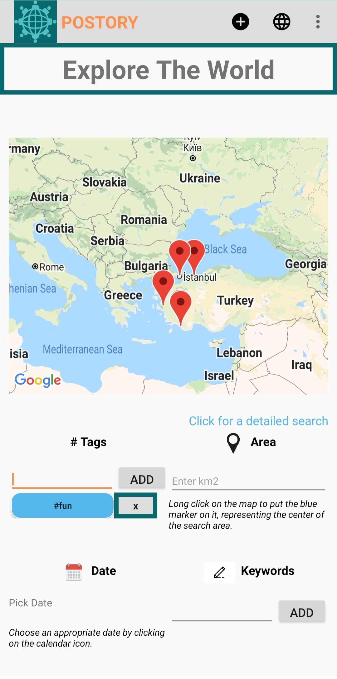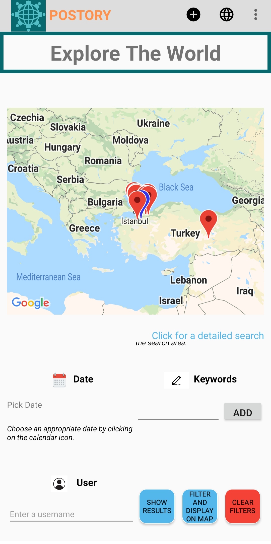 An example discovery page can be seen above (see Fig1). Users can specify their filters below the map. Here, users can enter tag, date, keyword, user, and area to filter the posts. After specifying the filters of choice, users can see the resulting posts either on the map (i.e., by clicking the Filter and Display on Map button) or on a different page (i.e., by clicking the Show Results button).