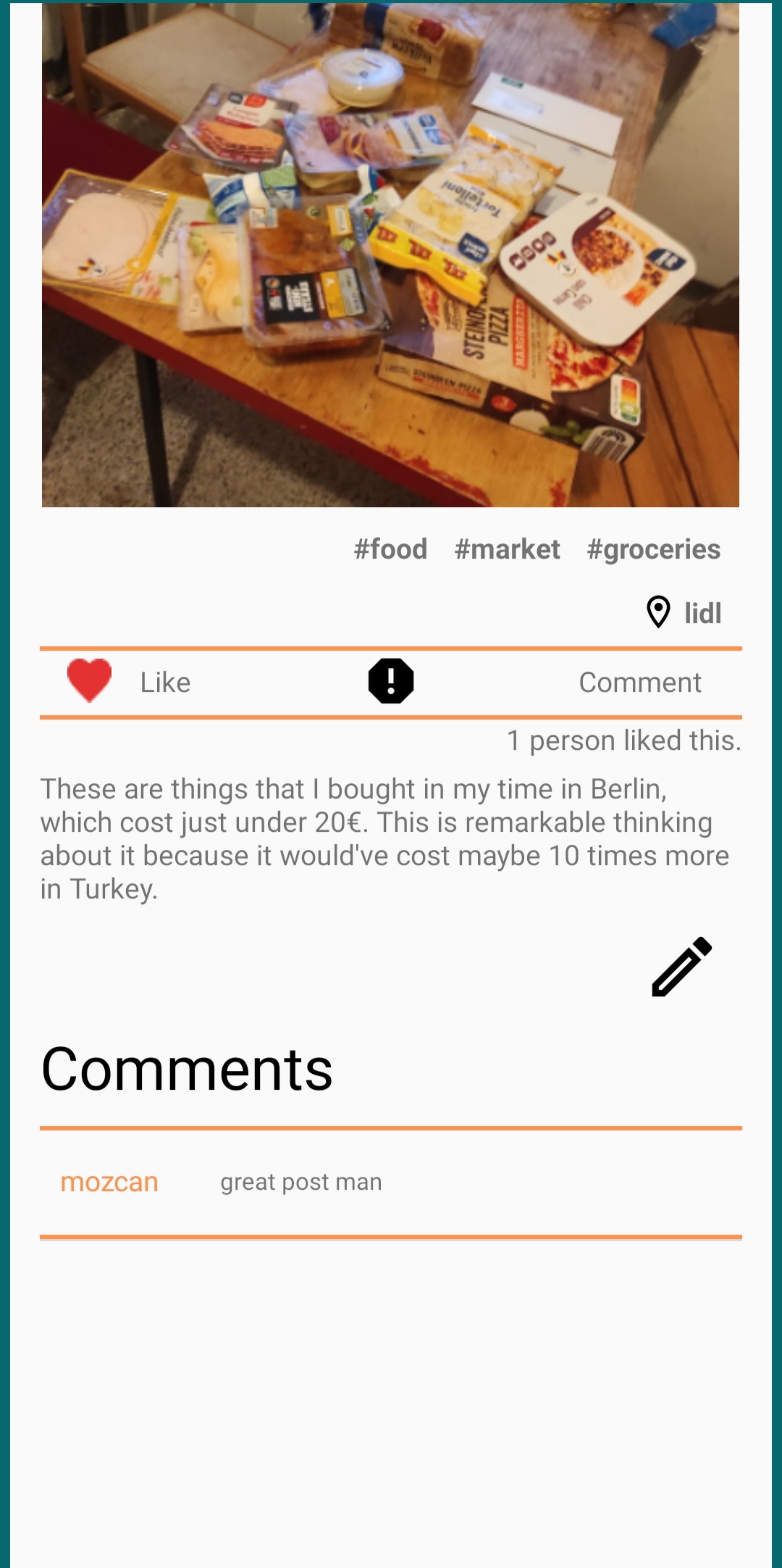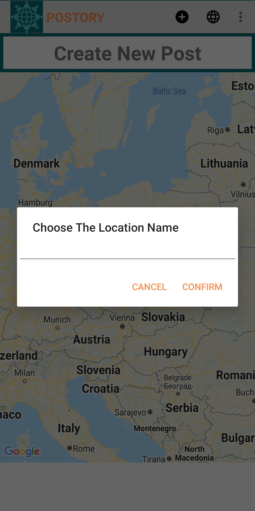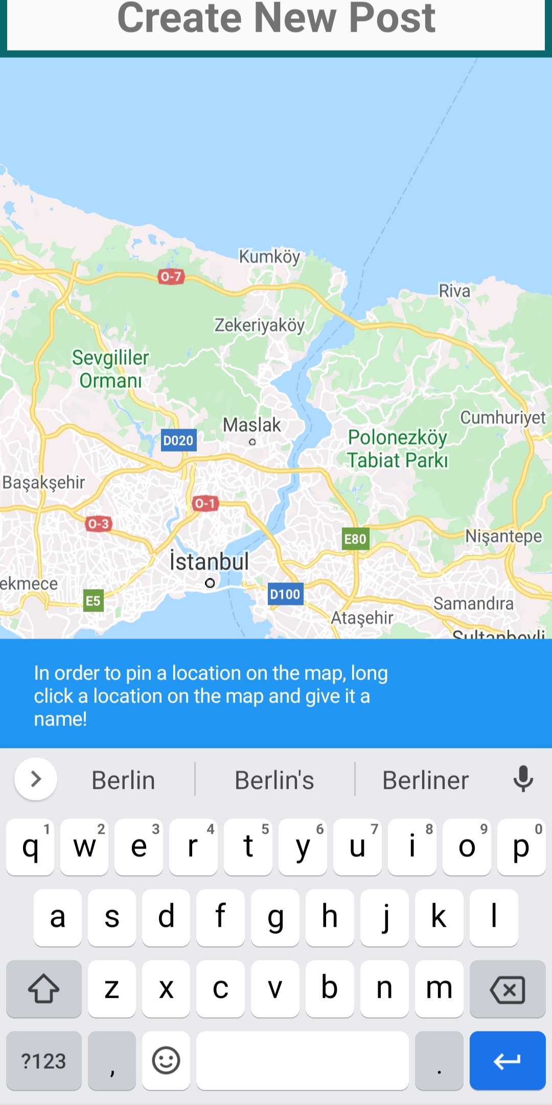 - After that if the user wants to add locations to the post, he can click the pin icon, which prompts him/her to a map.(see Fig18) After long clicking a location, a text box appears which the user can write a location name to. (see Fig19) With this, choosing location is done.