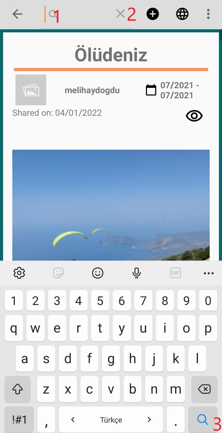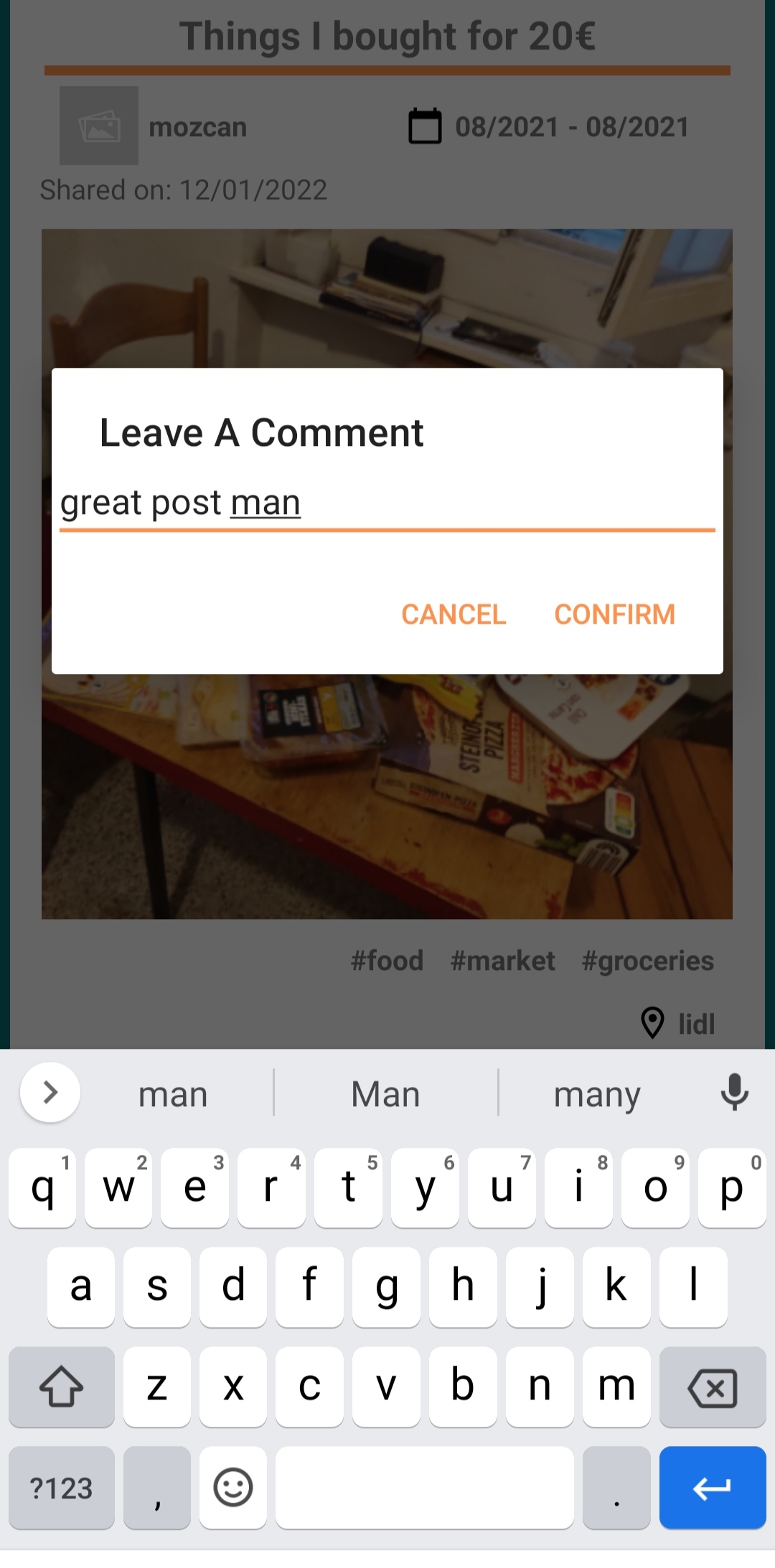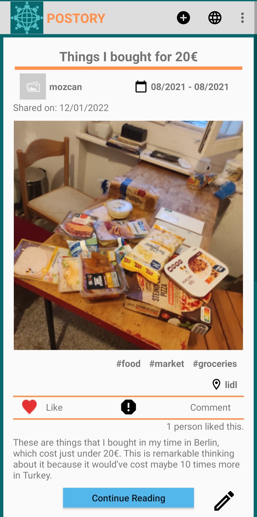 - After that if the user wants to add locations to the post, he can click the pin icon, which prompts him/her to a map.(see Fig18) After long clicking a location, a text box appears which the user can write a location name to. (see Fig19) With this, choosing location is done.