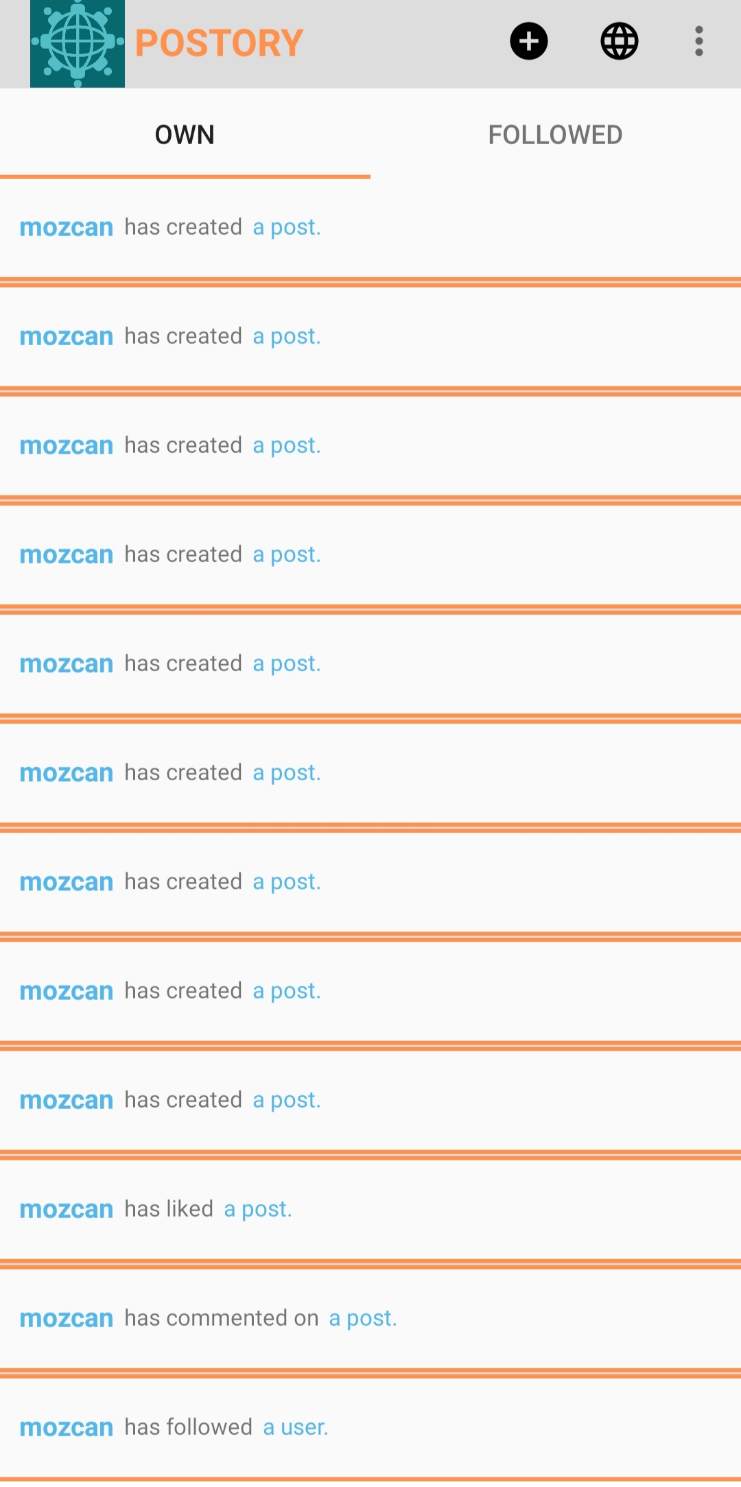 - Own tab: Show activities committed by the current user. Activities include creating, editing, liking and commenting on posts and following other users.