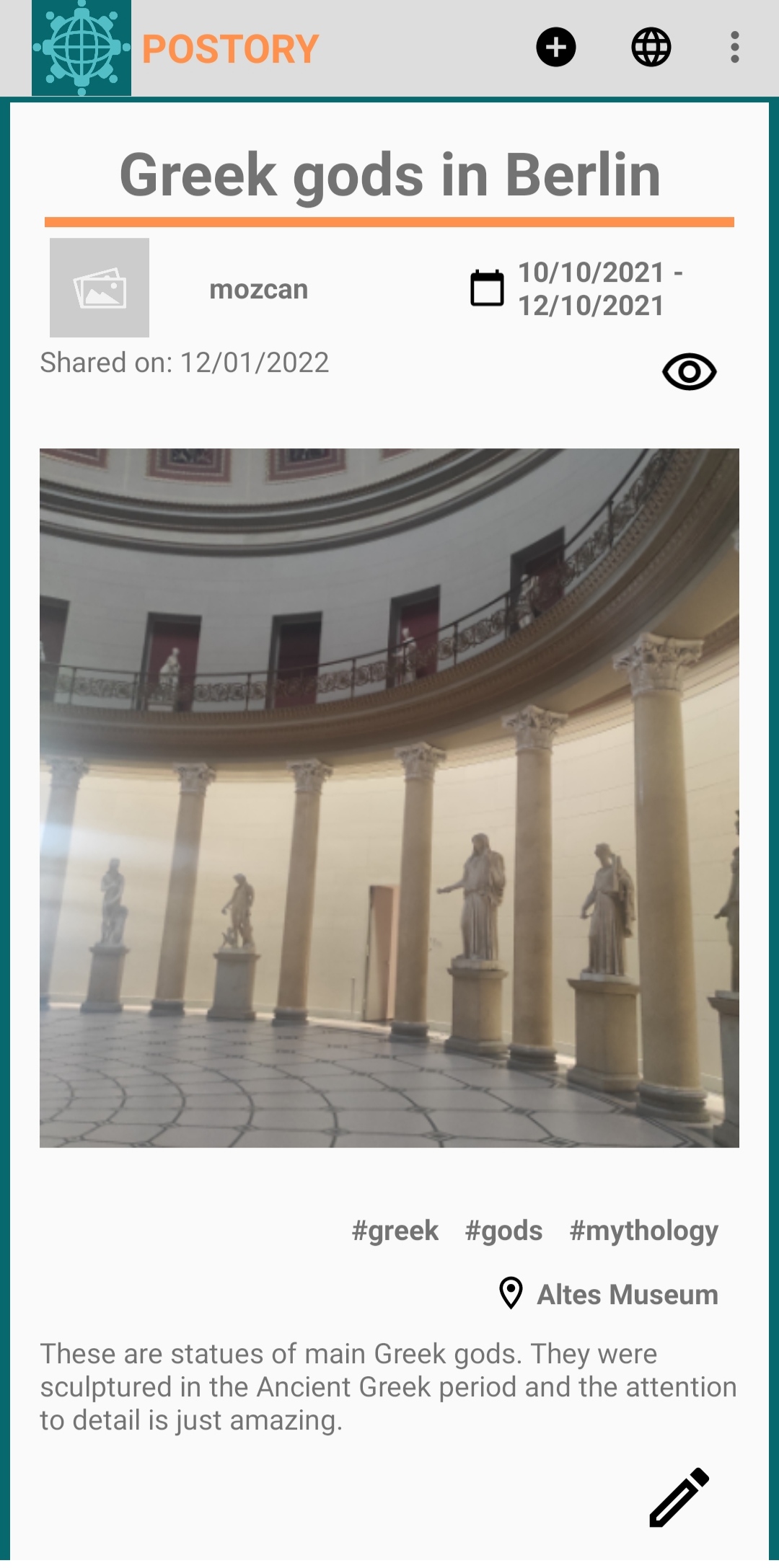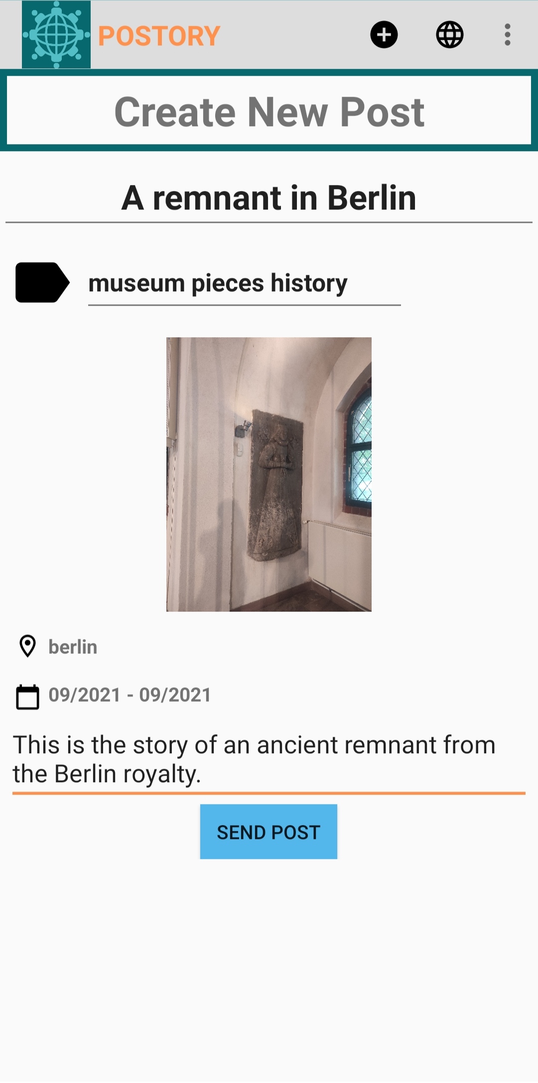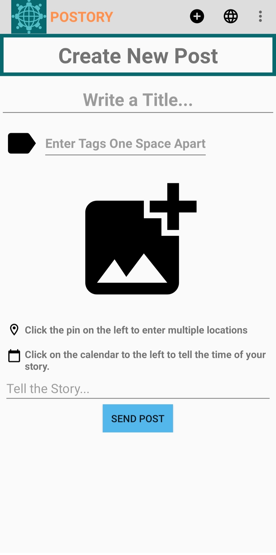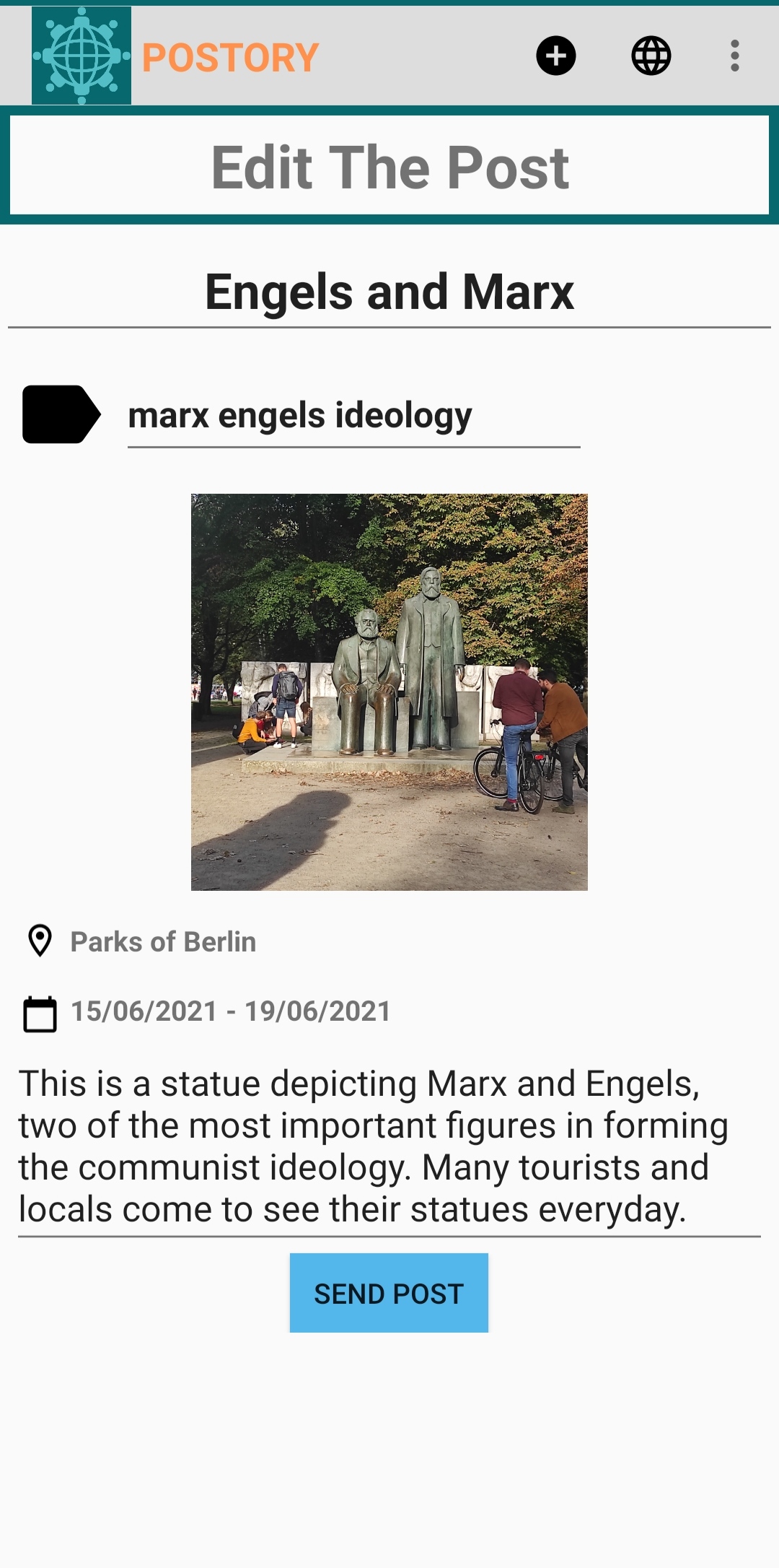 Editing a post can be done by clicking the pen icon on the homepage or the View post page. This functionality uses the same page as the Create Post page but for editing, the features of a post are already displayed. User can edit various features of a post, including the tags, geolocation, the title, the date and the story. Upon changing the desired fields, user can click the Send Post button (see Fig23) so that the post will be updated and the user will be directed to the homepage.