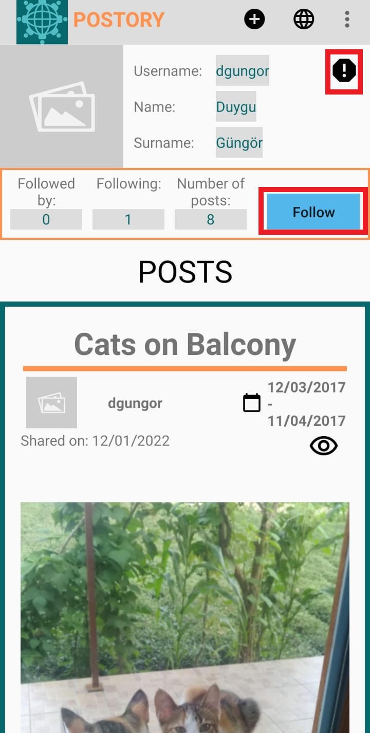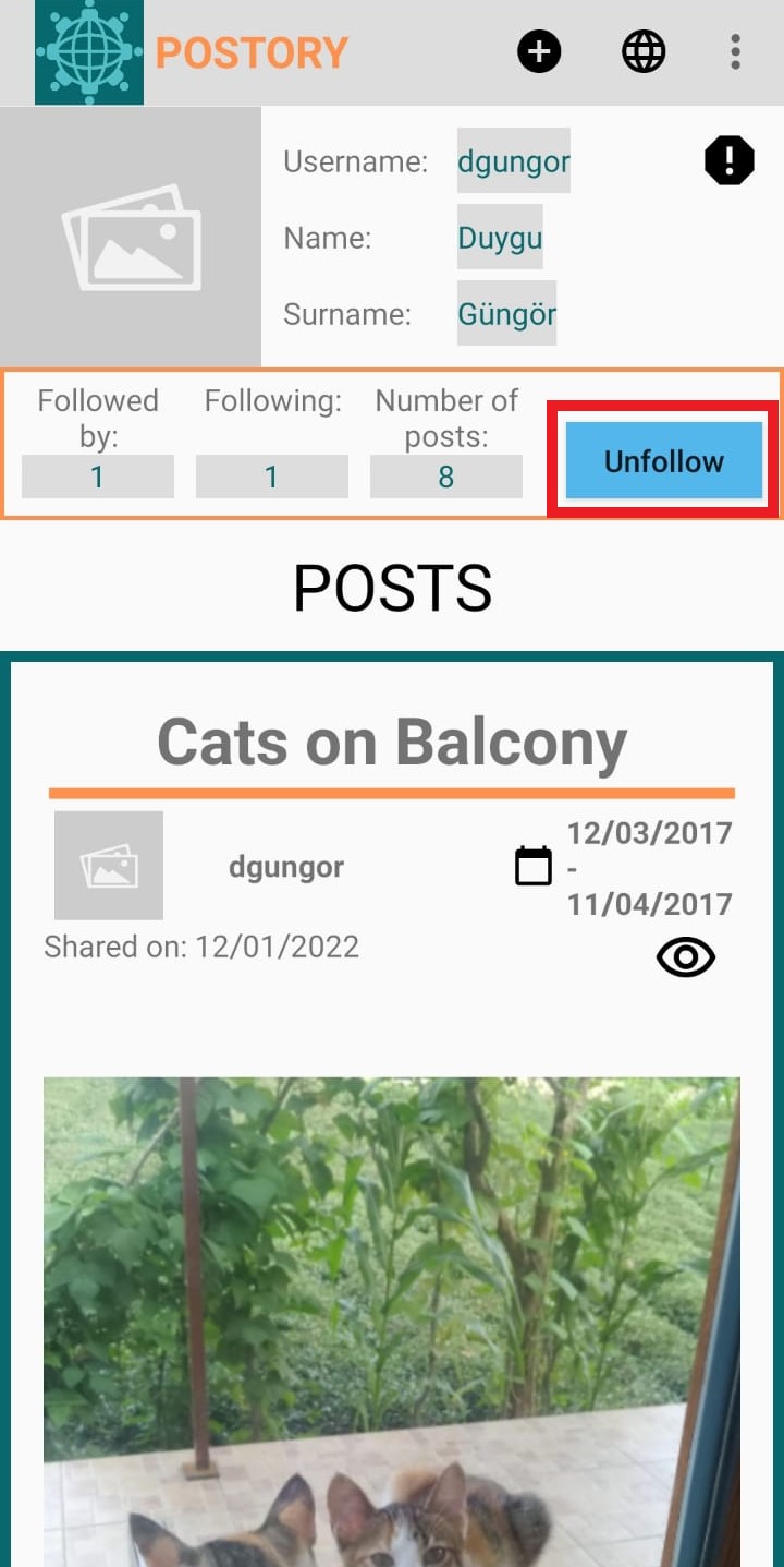 Users can interact with users (i.e., follow/unfollow) by clicking the Follow button (see button in red square on Fig7). If it is a private profile, a follow request will be sent to that user. If a user already follows another one, when she navigates to that user’s profile, she sees the Unfollow button (see button in red square on Fig8)
