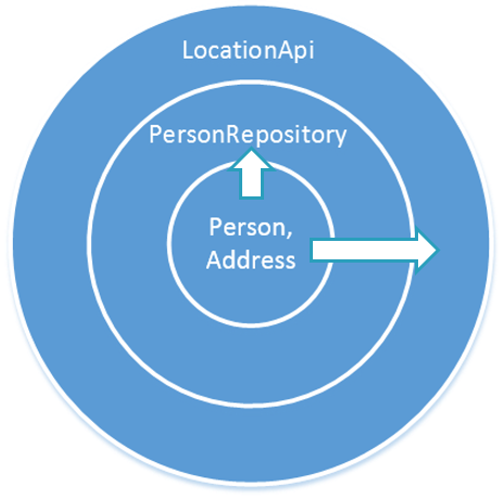 The relations you see on this diagram point upwards, from the inner core of the onion to the external layers. At the same time, the onion architecture tells us that all communications should go in the backward direction only, from the upper layers to the inner ones. Violation of this guideline tells us that the domain model is leaking.