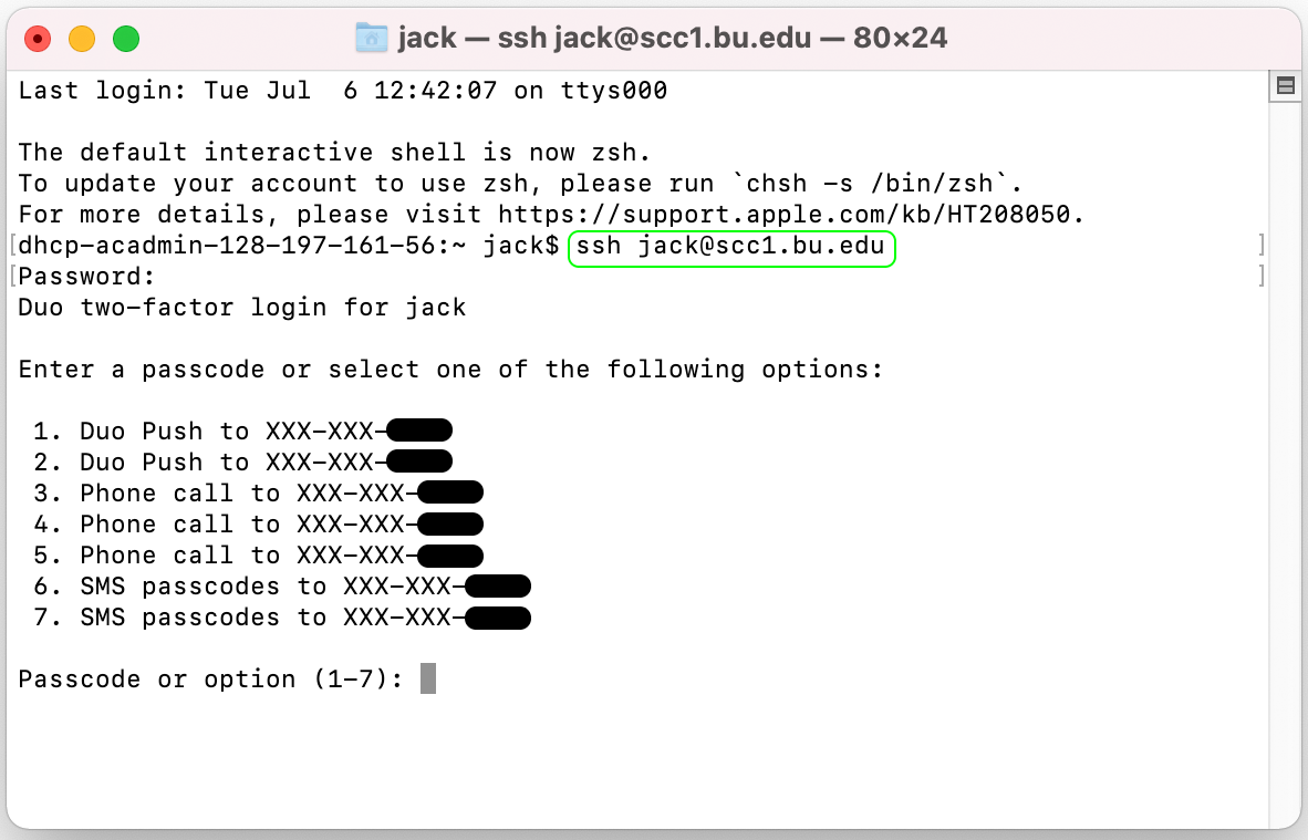 In the terminal, type ssh [email protected]. Enter your BU Kerberos password when requested. Note that the characters in your password will not be displayed when you type them as a security precaution. You will also be asked to use Duo two-factor authentication.