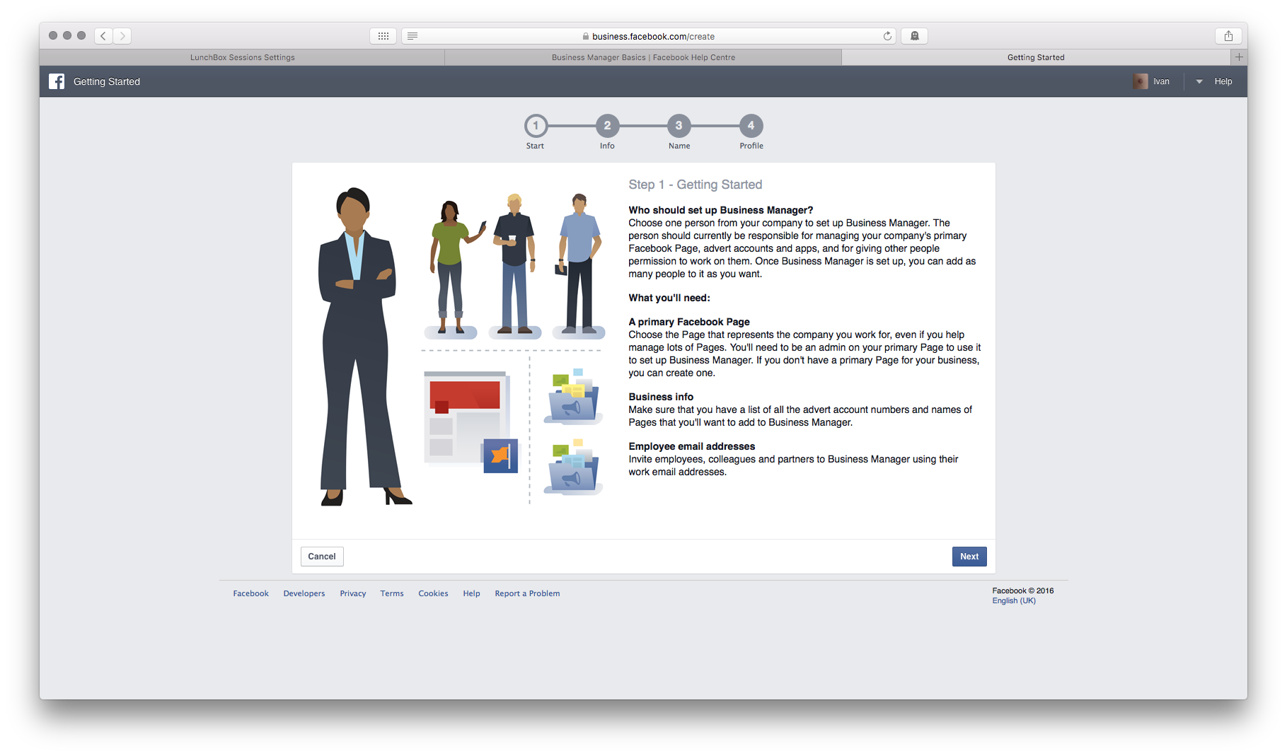 The Facebook Business setup page does a good job of onboarding. We could adopt something like this for our Owner users.