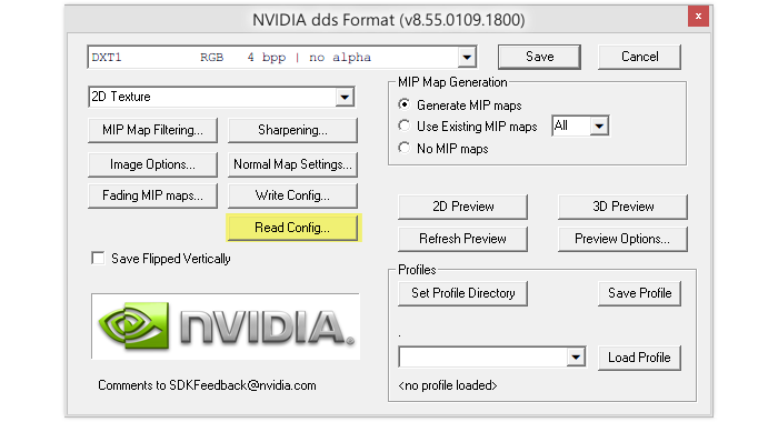 - Note: some versions of Photoshop, such as Creative Cloud (CC), don't automatically display the DDS Read Properties window when opening texture files. To access the window in those versions instead first go to save any file as a DDS (see step 1 in the following section) then when the Nvidia export options window appears click the Read Config button, which will open the same options window as seen above.