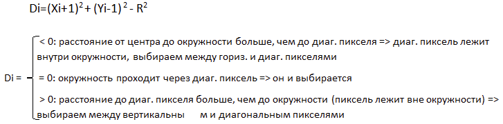 Такой величиной D является разность квадратов расстояний от центра окружности до диагонального (Xi+1,Yi-1) пиксела и до идеальной окружности:
