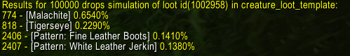 (1002958, 818, 0.24, 0, 1, 1, 0, 'Tigerseye');At this stage, we have a chance to get either nothing, Malachite, Tigerseye, or both Malachite and Tigerseye.