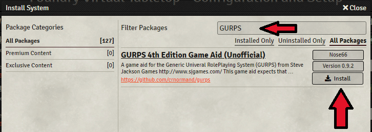 In the “Filter Packages” input field, type “GURPS”, and you will see our Game Aid. Click the “Install” button and you are good to go!