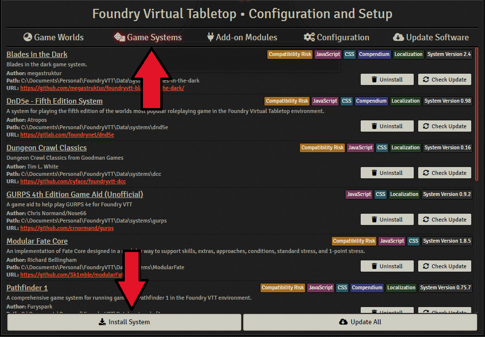 And that is it. You will be notified if we release newer versions, and you can automatically upgrade from the “Game Systems” tab, without having to reinstall.