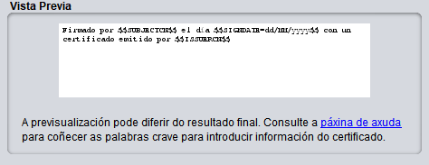 O texto pode incluír unha serie de palabras crave que serán substituídas polos textos apropiados do titular ou emisor do certificado de firma: