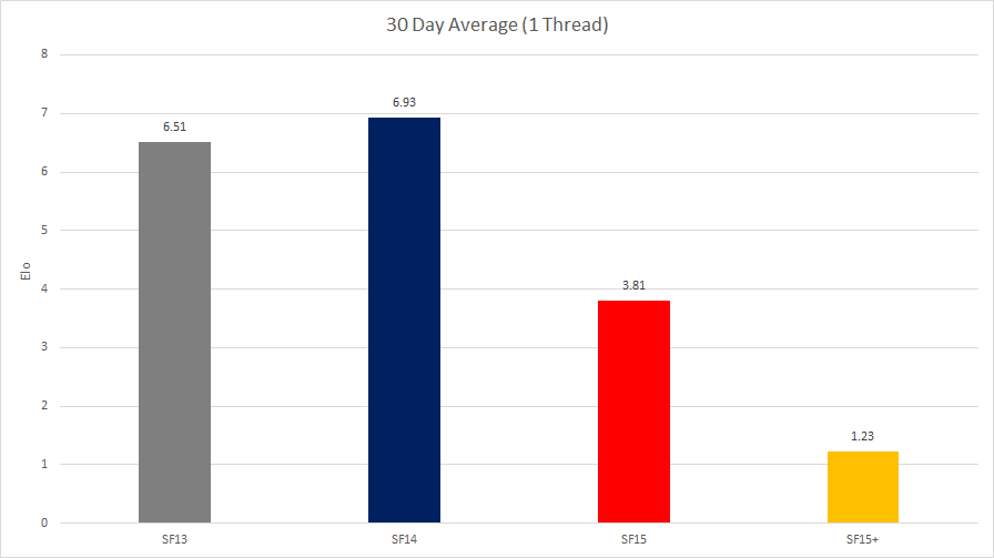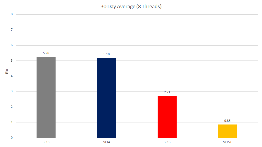 8 Threads30 seconds + 0.3 seconds for 40,000 games(13/12/2018 - current) -