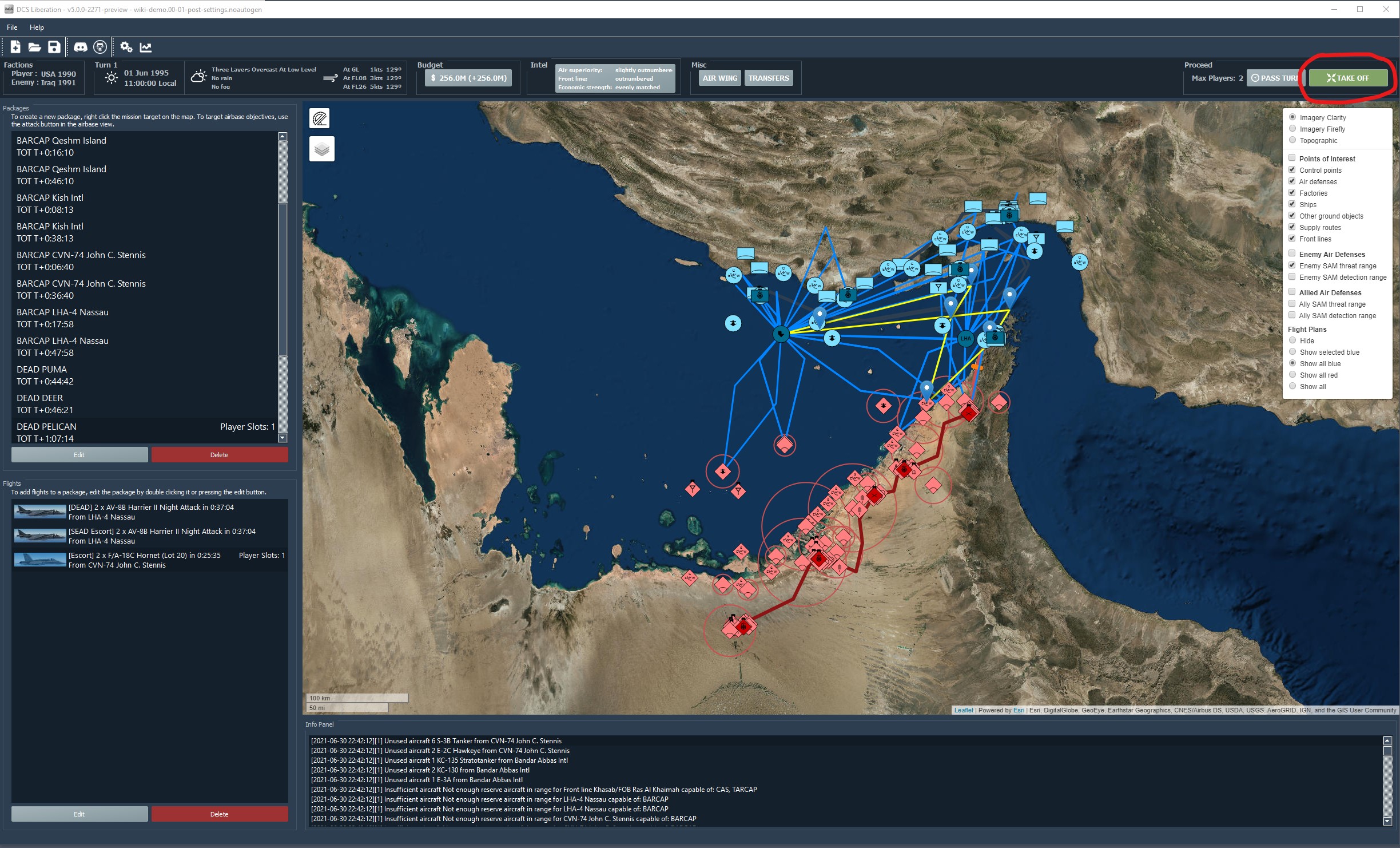Then w click on the "Take Off" button in the toolbar on the upper right, and Liberation will generate a mission for us.
