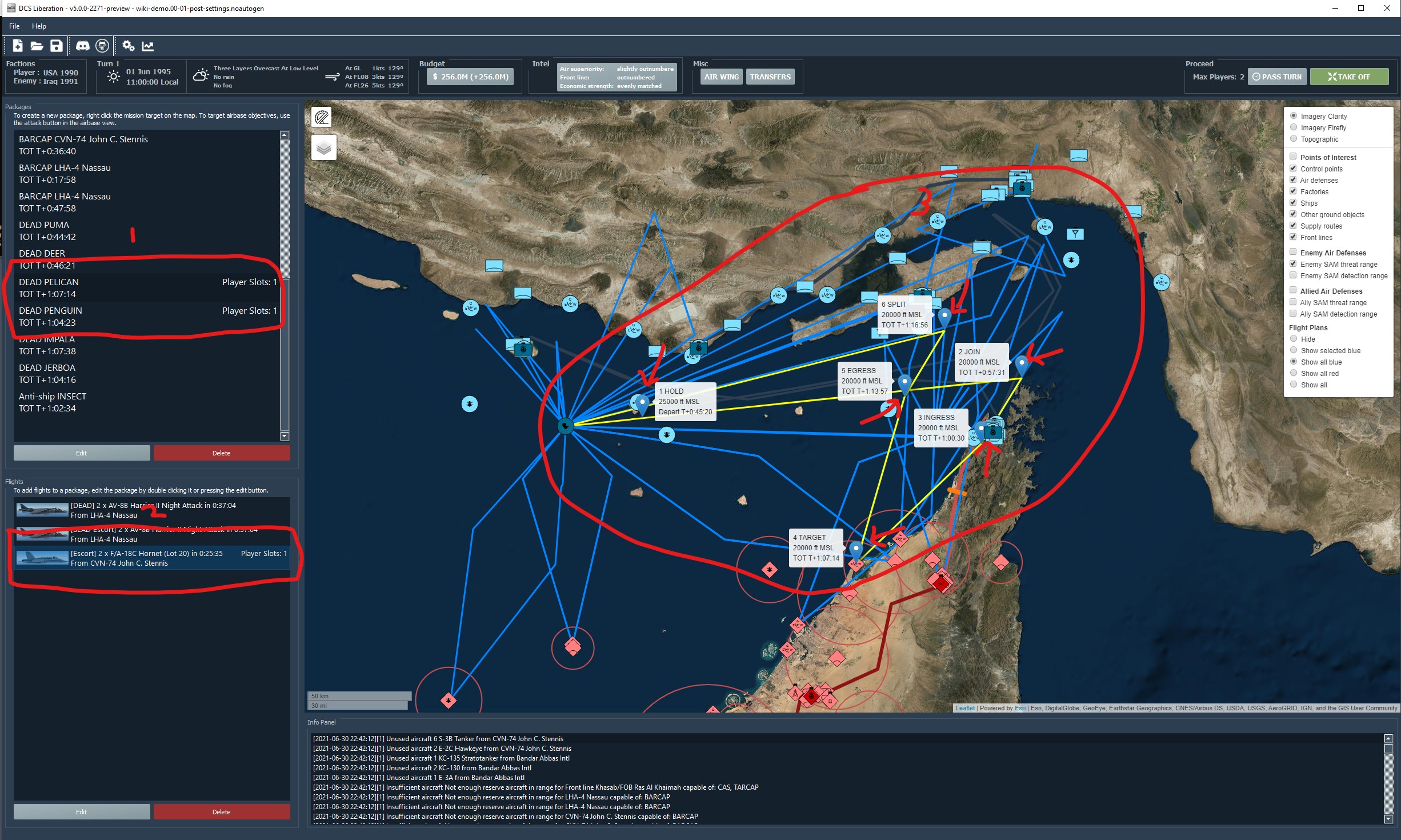 We see the number of Player Slots per package in the Packages window (1): "DEAD PELICAN" and "DEAD PENGUIN". So, in this case, two DEAD packages (Destruction of Enemy Air Defenses -- strike against SAM targets) have been planned, each with one player slot assigned.