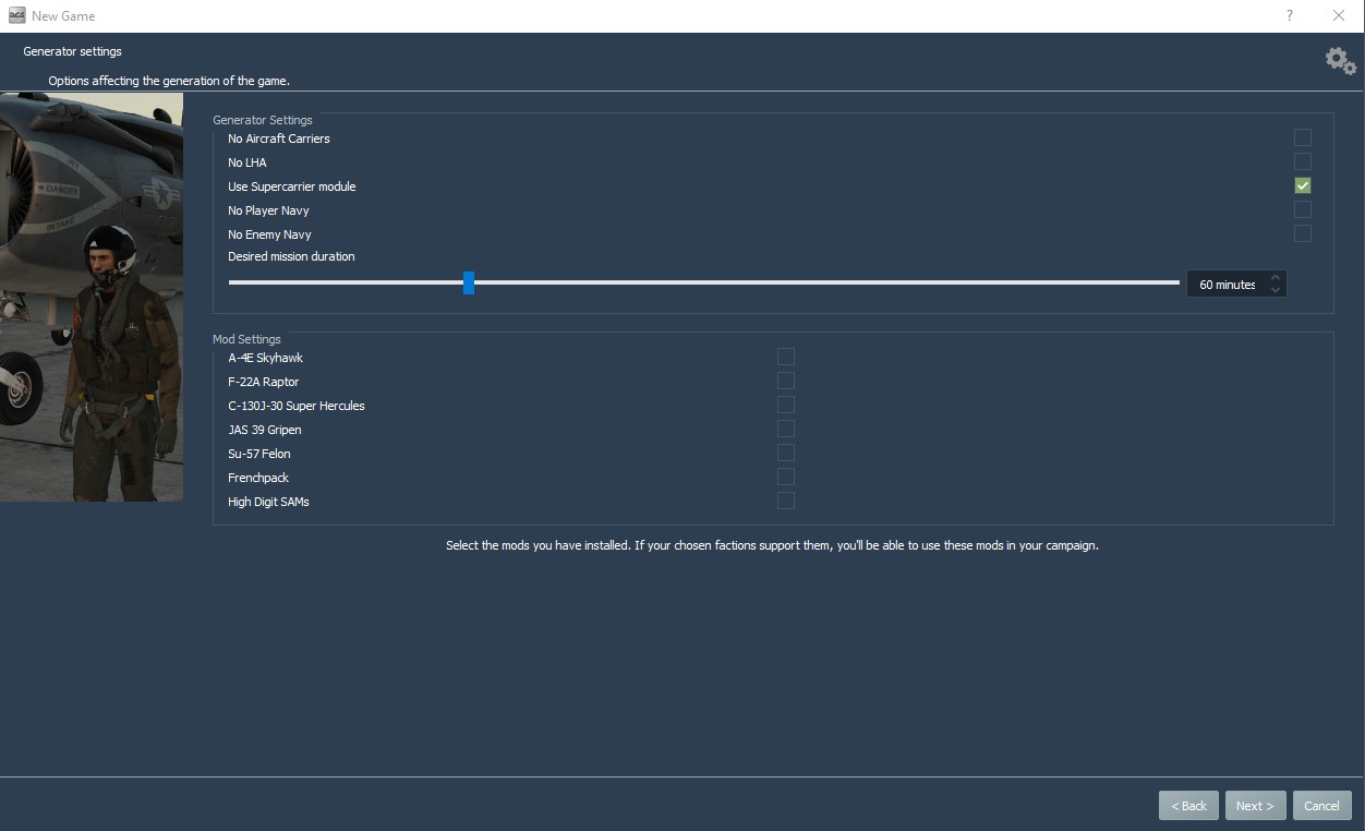 So, for example, in the top box we can decide whether or not we want to allow aircraft carriers (and, if so, the supercarrier), helicopter carriers, or even any form of navy at all. We can also set the desired mission duration. Note that the only thing this effects is the AI mission planning -- the AI (our, side if we do not opt out later on for the AI to plan our missions, as well as the opposing side either way) will not plan any missions past this time. We will still be able to play the mission for longer than this, but we will find things strange as the enemy may not have any CAPs on station or indeed much activity at all. (Also note that we can always end the mission anytime, with the caveat that some of the AI may not have completed their assigned tasks).