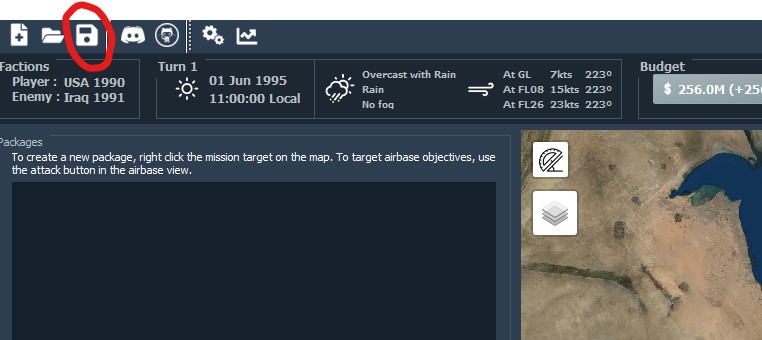 As noted above, a "faction" in game terms essentially determines the types of aircraft, ground vehicles, air defenses, etc. that each side will have available. Changing the faction using the dropdown boxes next to "Player faction" and "Enemy faction" will change the listing of types available under each. Obviously, this will have massive difference in the campaign play, and we can set up anything we like, realistic or not, balanced or not. In actual play, should spend some time stepping through different factions and reviewing their hardware/equipment to see what suits our whims, interests, etc. For the same campaign, we can set up factions so that we play out everything from a peer-to-peer symmetrical conflict to a COIN conflict, or anything in between. Moreover, we can select factions with hardware from different periods to capture WW2-ish, Cold War, or post-Cold War technologies and dynamics.