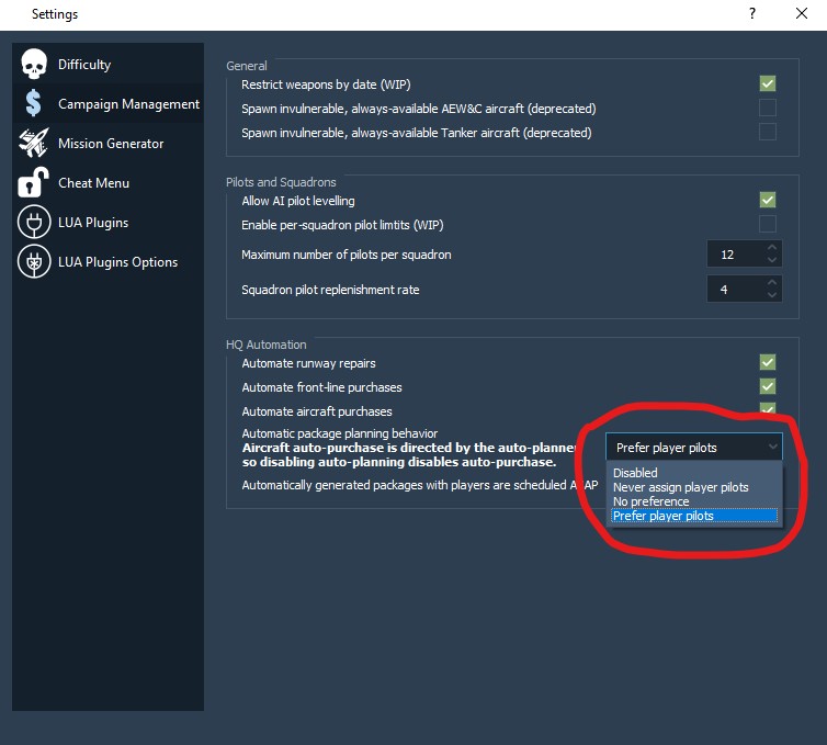You can read about the various options available here. For now, we are going to ask Liberation to run the mission planning for us, and set this to "Prefer player pilots", to make sure that sorties get assigned to human pilots first, and flights will only be assigned to AI after all human pilot slots are filled.