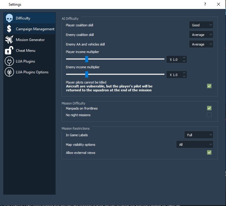 We can leave all of these at their defaults, though we may want to select the "No night missions" options if our preferred aircraft does not do well in those conditions.