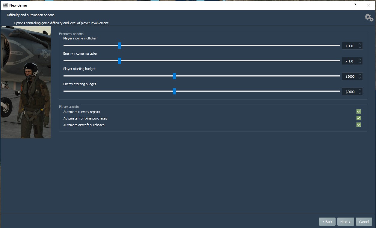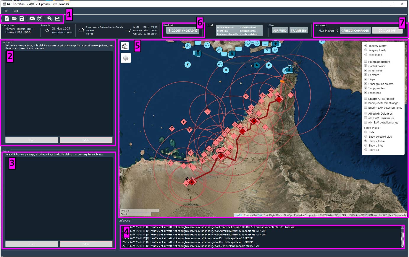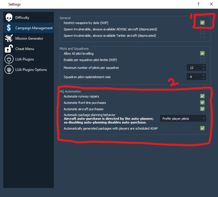 In the bottom box (2), we can decide how much of our strategic and tactical planning is done for us by Liberation. We have already asked Liberation to manage our assets and resources in the campaign setup, and this is indicated by the checked boxes: "Automate runway repairs", "Automate front-line purchases", and "Automate aircraft purchases".