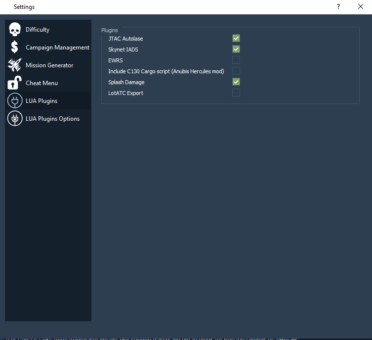 - "SkynetIADS": we want this checked! The default SAM behavior in DCS is very dumb -- their radars are active all the time, and they instantly launch as soon as the tip of our aircraft pokes into their wildest maximum range. This makes them easy to detect and defeat by "cheesing" (just poke in and out of their maximum range until they run out of ammo). Skynet greatly improves their behavior in a range of ways, including: simulating an IADS (Integrated Air Defense System, by linking together information from multiple sensor platforms including EW radars); the radars being dark until something is in range; the missiles not firing until something has a decent probability of not escaping; radars going dark when they detect anti-radiation missiles heading their way, etc. etc. It changes the gameplayer entirely and for the better. SAM sites can actually be suppressed for example, by HARMs. Furthermore, it also improves performance as radars are a major resource hog.