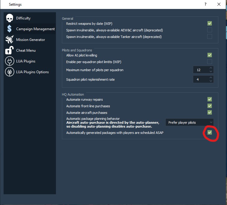 - "Player flights ignore TOT and spawn immediately": checking this box will allow we to spawn in anytime, as opposed to waiting for our flight's fragged start time. Our published route and waypoint timing will still reflect the mission plan, though, of course, it will be up to we to fly it accordingly.