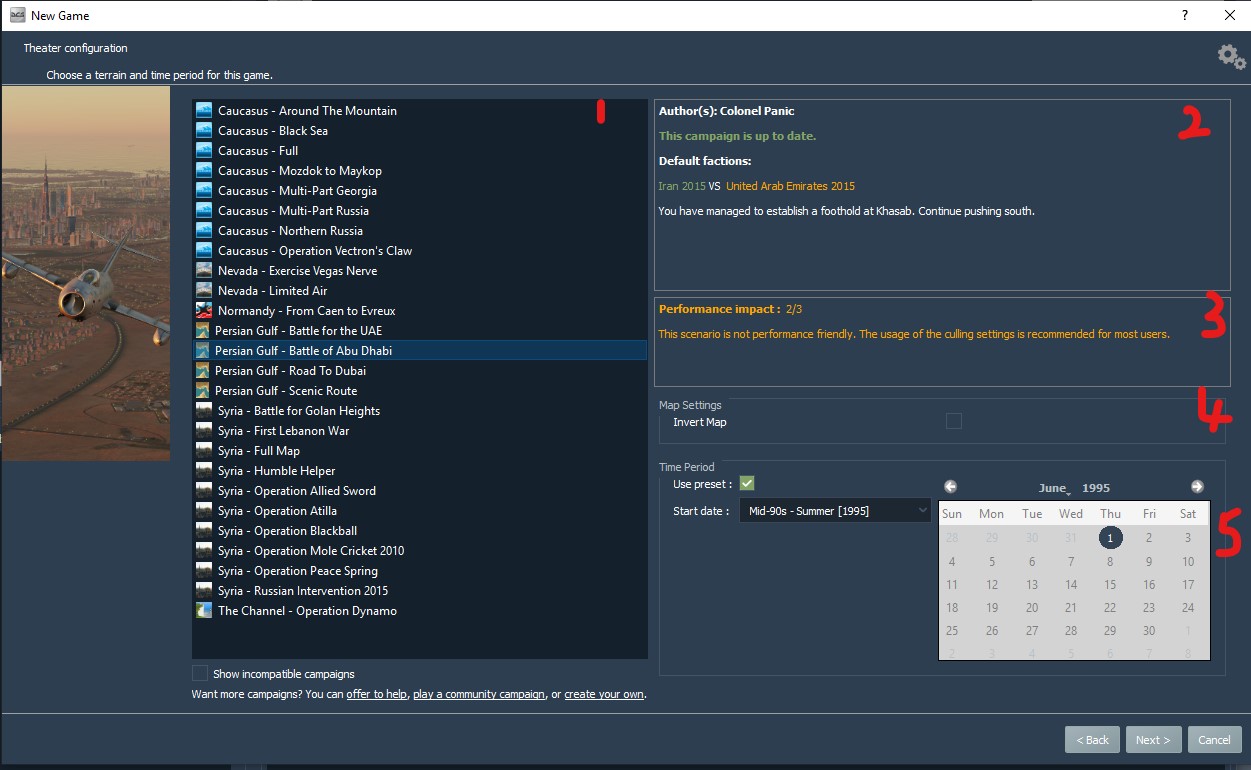 Next to the campaign itself, the time period is probably the most important option we will want to consider on this page. For now, let us select "Persian Gulf - Battle of Abu Dhabi" as the campaign, and leave all the settings at their defaults, including the default time period (Summer 1995). Click on "