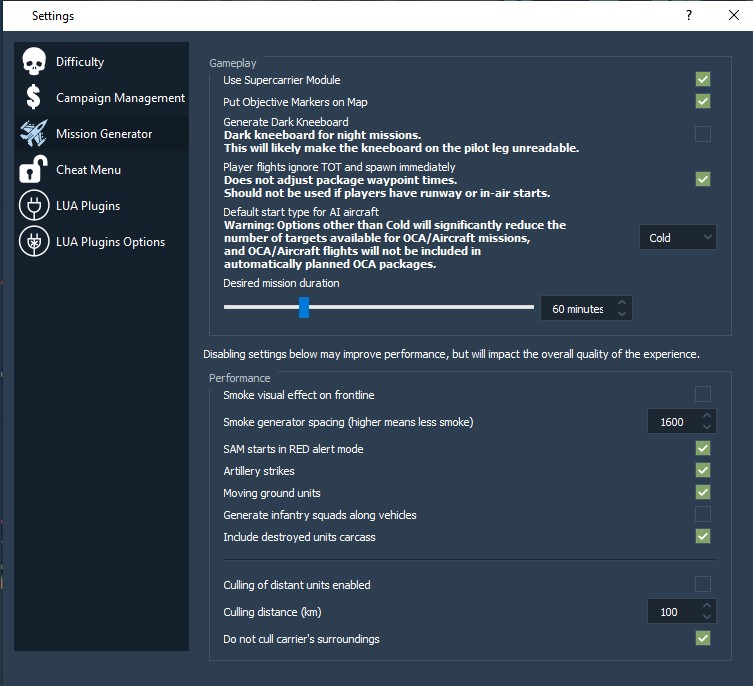 The bottom box has some important ways for we to manage performance. In particular, we probably want to UNCHECK "Smoke visual effect on frontline" and "Generate infantry squades along vehicles". As noted in the optimization tips, culling of distant units will help by preventing aircraft spawning more than a certain distance from the frontlines.