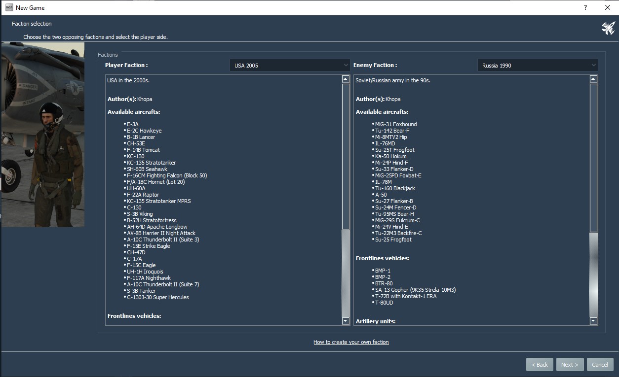 In terms of game mechanics, a "faction" essentially determines the types of hardware that each side will have access to during the campaign (i.e., what aircraft, ground vehicles, ships, air defenses, etc.). The default factions may reflect historical or pseudo-historical units for a particular conflict a campaign is replicating, if any, or otherwise something that the campaign designer selected for balance or whimsy. We will have the option to customize the factions on the next page, so don't worry if we do not like the default factions, or even if we do not really understand what hardware is associated with each faction as this will be listed later.