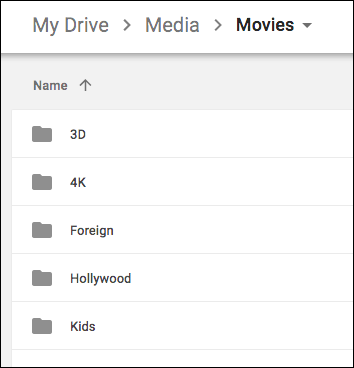 Let's say you wanted to have separate movie libraries for: 3D, 4K, Foreign, Hollywood, and Kids. You would first have to create these folders within the /Media/Movies path in Google Drive. /Media/Movies folder will contain nothing but these folders.