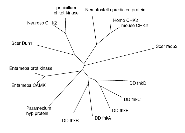 In Dicty there are five proteins in the rad53 family, fhkA,B,C,D,and E. A tree was constructed from the highest-significance Blast hits of the Dicty proteins in other organisms (below). According to this tree, none of the Dicty sequences appears to be the unique ortholog of CHK2/rad53.