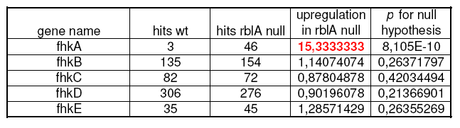 FhkA is substantially and highly signficantly upregulated in the ko strain, while none of the other genes show major changes. Consistent with its regulation, the fhkA promoter contains a putative E2F-type binding site (TTTGCGCCTTTT).