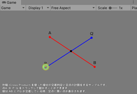 /3 Simple Intersection (Crossing Lines)/Crossing Lines シーンを実行し、画面の説明に従って点 A, B, P, Q をドラッグすると、線分 AB と PQ の交差判定をして交差している時は交点座標を計算し、黒い点が交点に表示される。