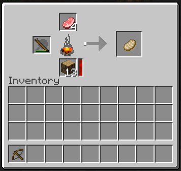 ##Cooking The campfire can actually cook meat into its cooked form when provided with a pan or rotisserie. These items go in the left slot, but use up durability. The spit is easily made out of two roasting sticks, but only has four uses before breaking. The pan needs iron to craft, but lasts 250 uses.