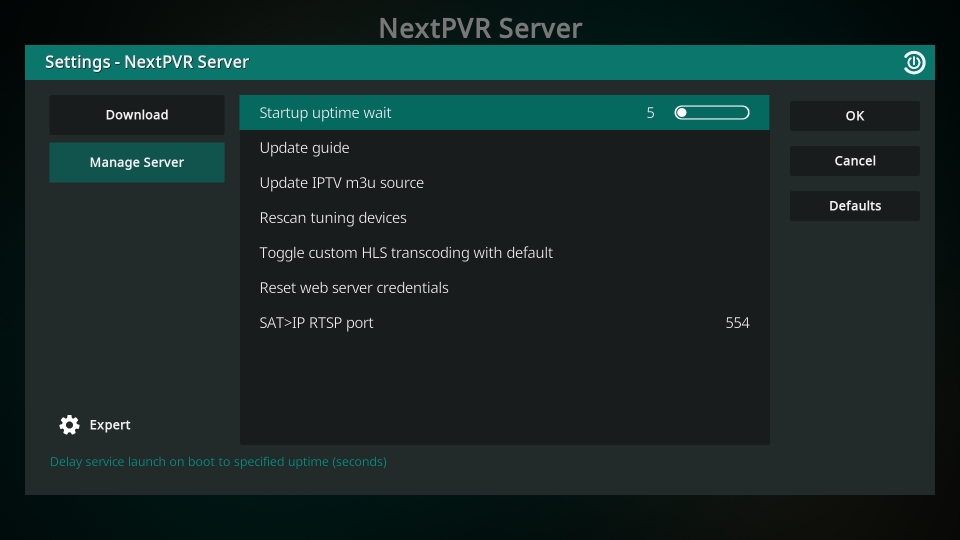 Startup uptime wait. This option allows you to delay startup of the service to allow required devices (eg tuners, networks, shares) time to load. This is the time in seconds from boot. Typically you would get this time from look in the dmesg or journalctl log for the device startup.