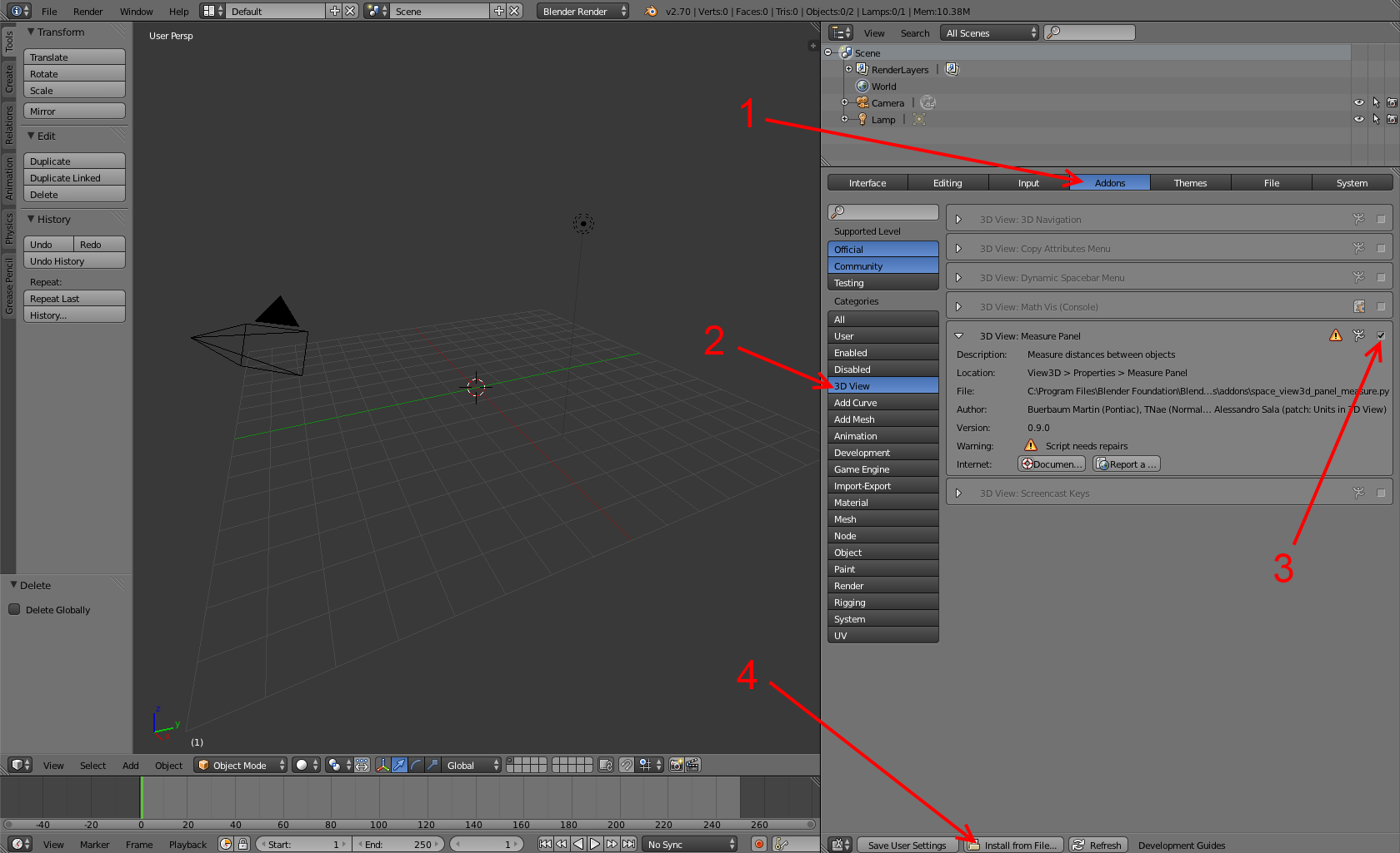 Now navigate to the Addons pane (1) and before we install the .mu importer while we're here let's also enable the Measure Panel plugin, which you can find in the 3D View category (2) and enable it by clicking the check box (3).