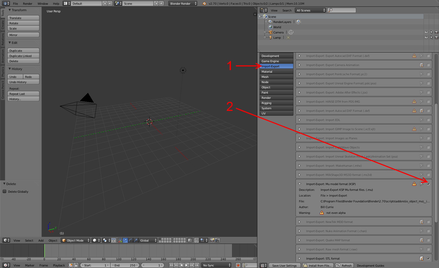 Blender will take us back to the main view with the Addons panel, and we can find the new addon in the Import-Export category (1) and enable it by selecting its checkbox (2).