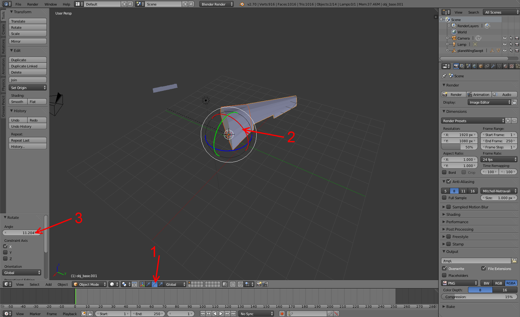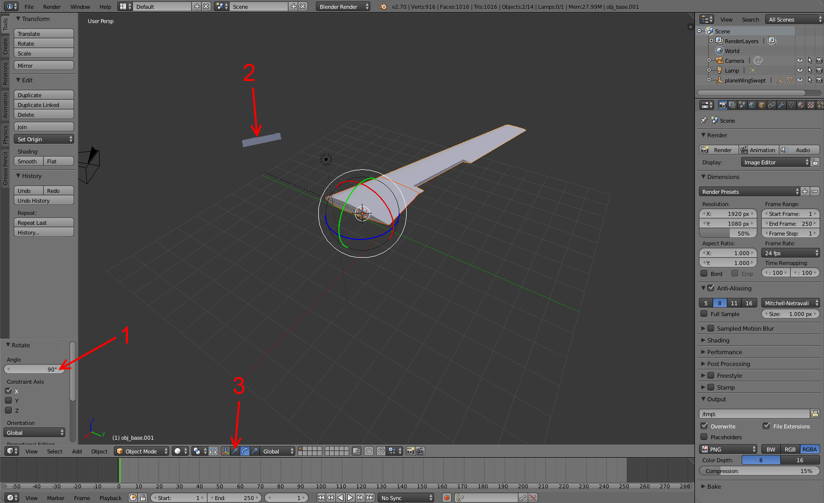 So let's make the angle 90 (1) so the mesh is flat. Now right-click to select the control surface you left behind (2), switch back to translation mode (3) and move that over near the main wing.