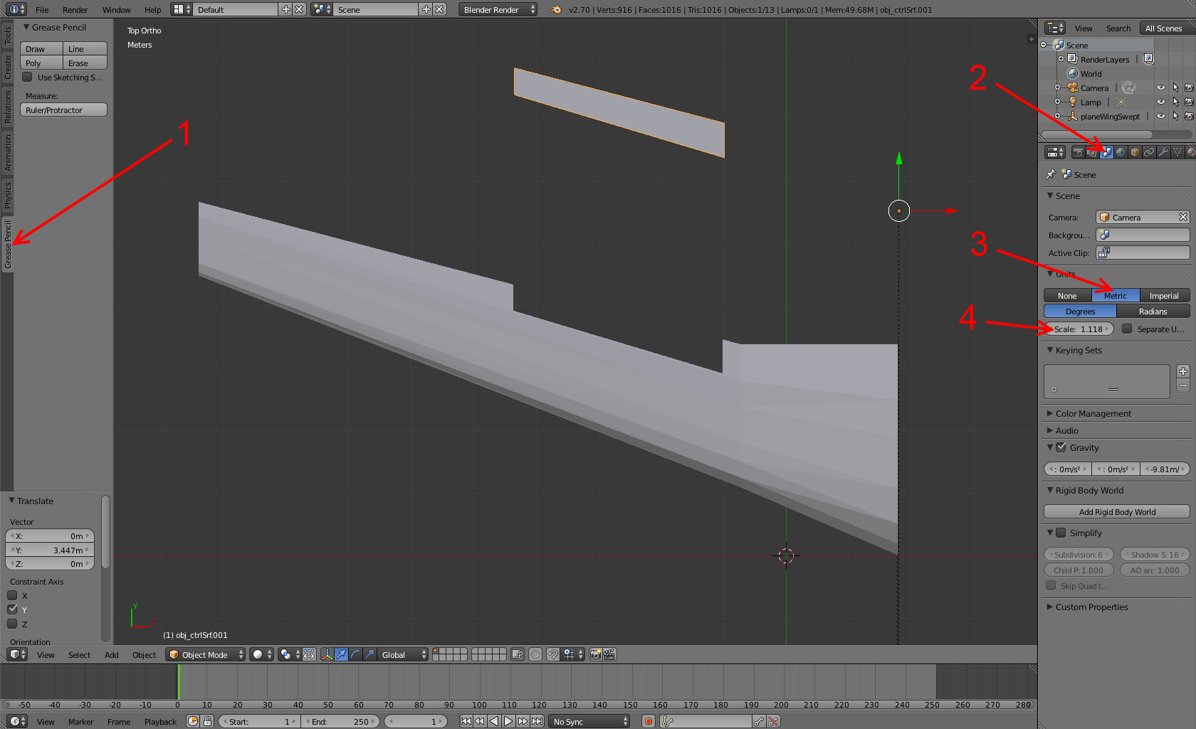But wait - it's not a meter stick unless you tell Blender you want it to be a meter stick, so click on the Scene button (2) and select Metric for units (3).