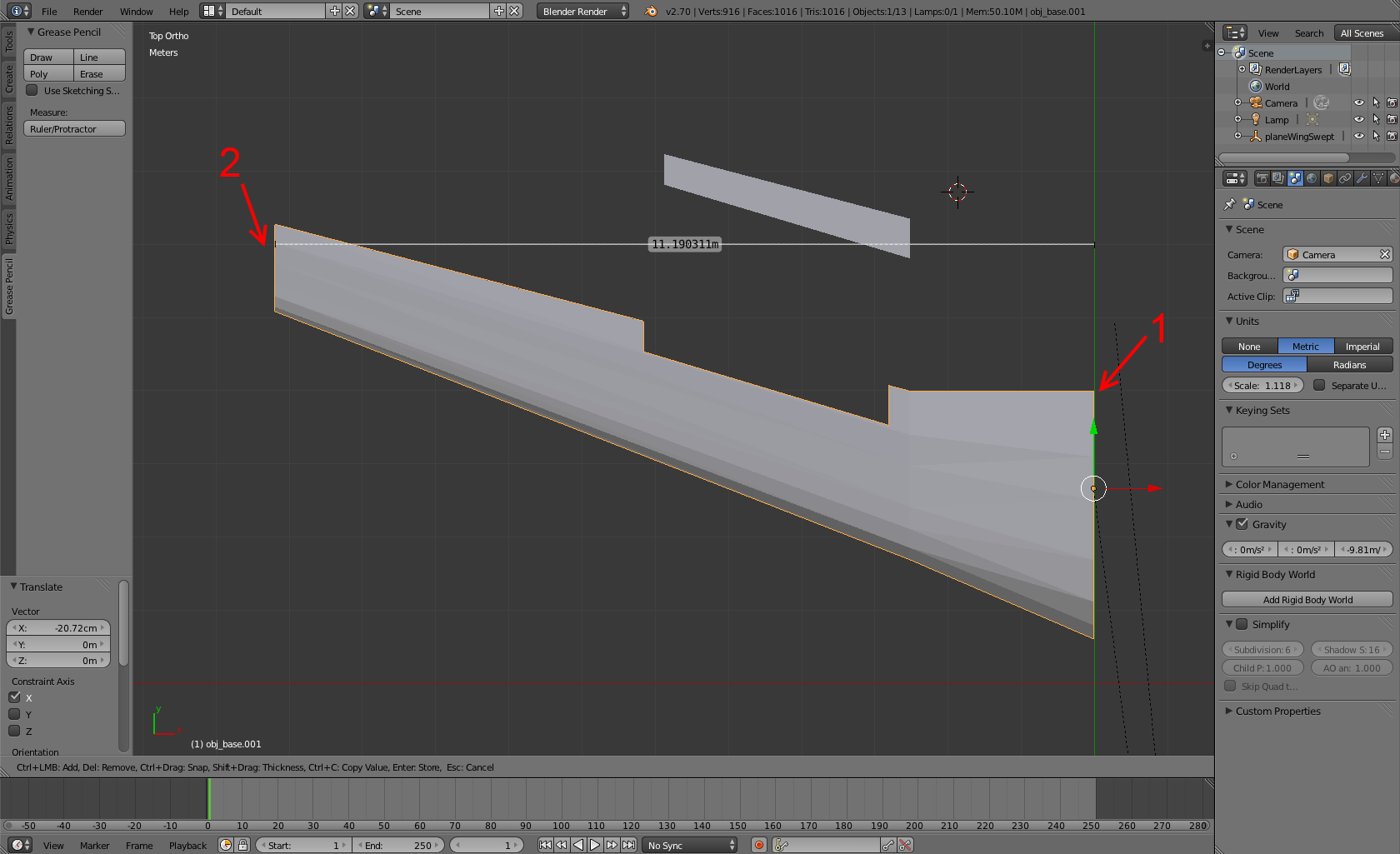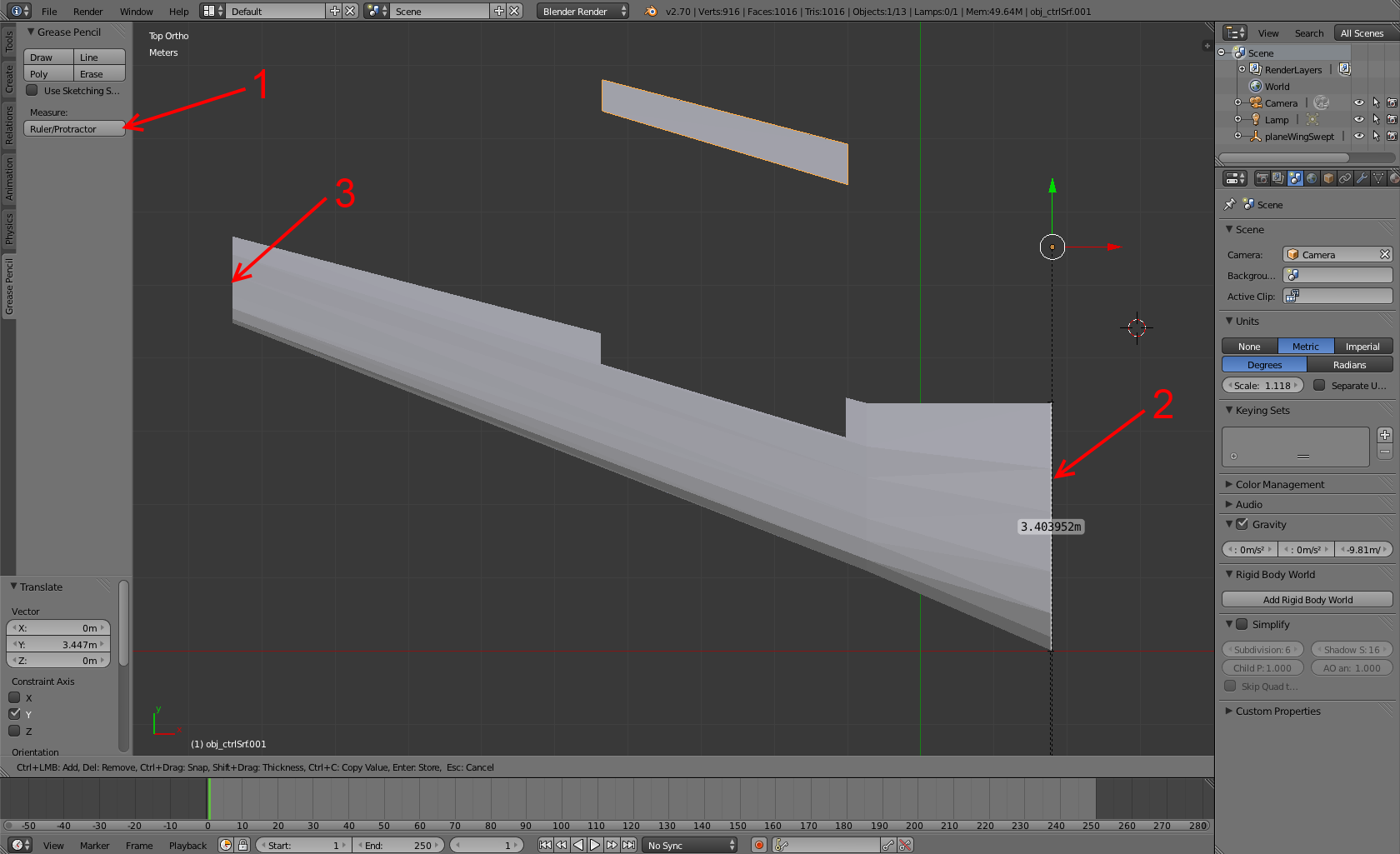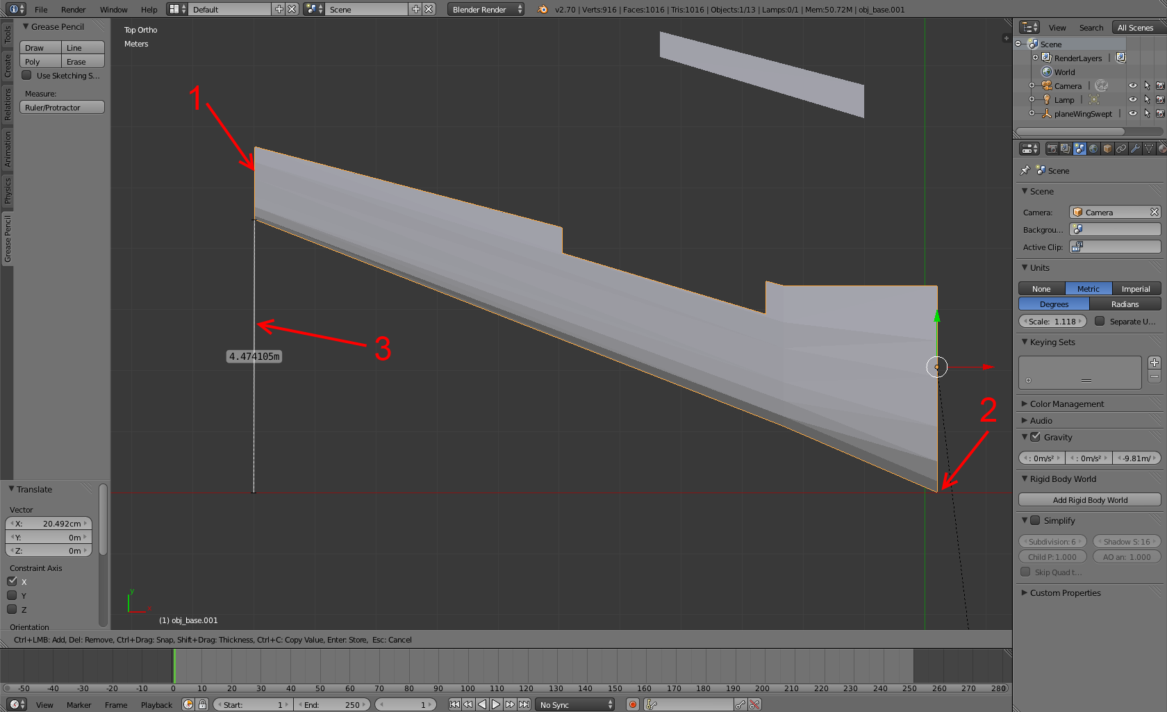 Because of the sweep, drawing a straight line from Root to Tip is difficult, but that's where the grid lines come to the rescue once again, by allowing us to align the Root (1) and then drawing a ruler from the Tip (2) along a horizontal grid line to the Root's vertical location.