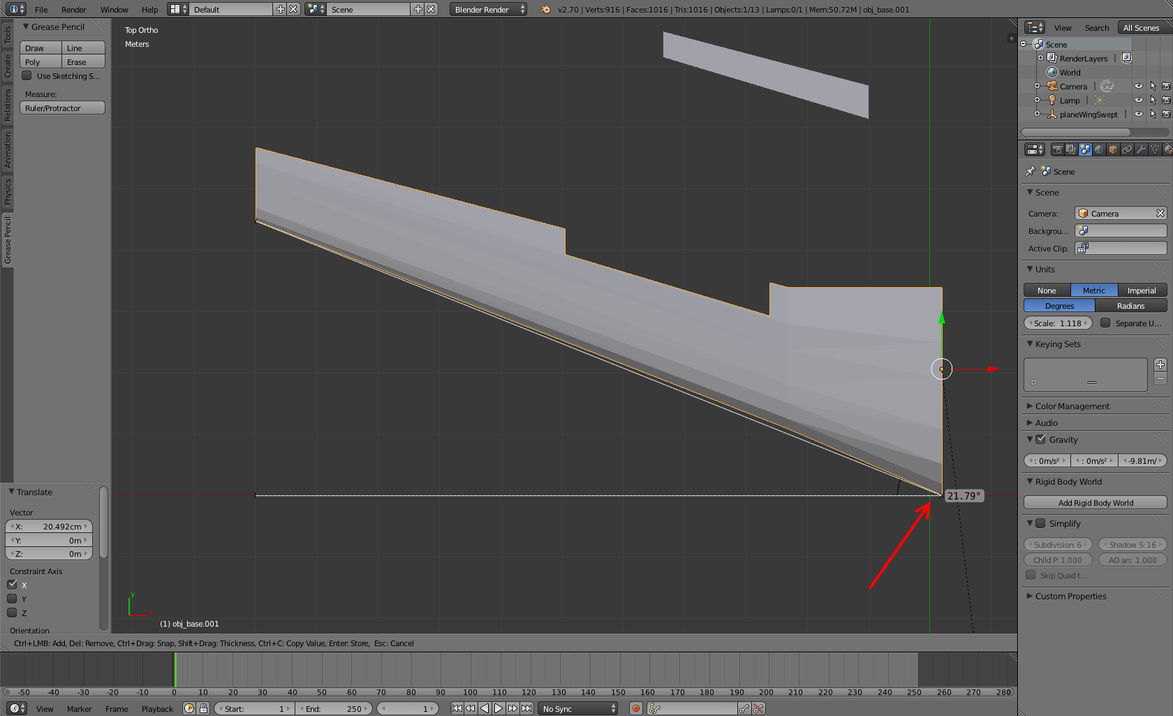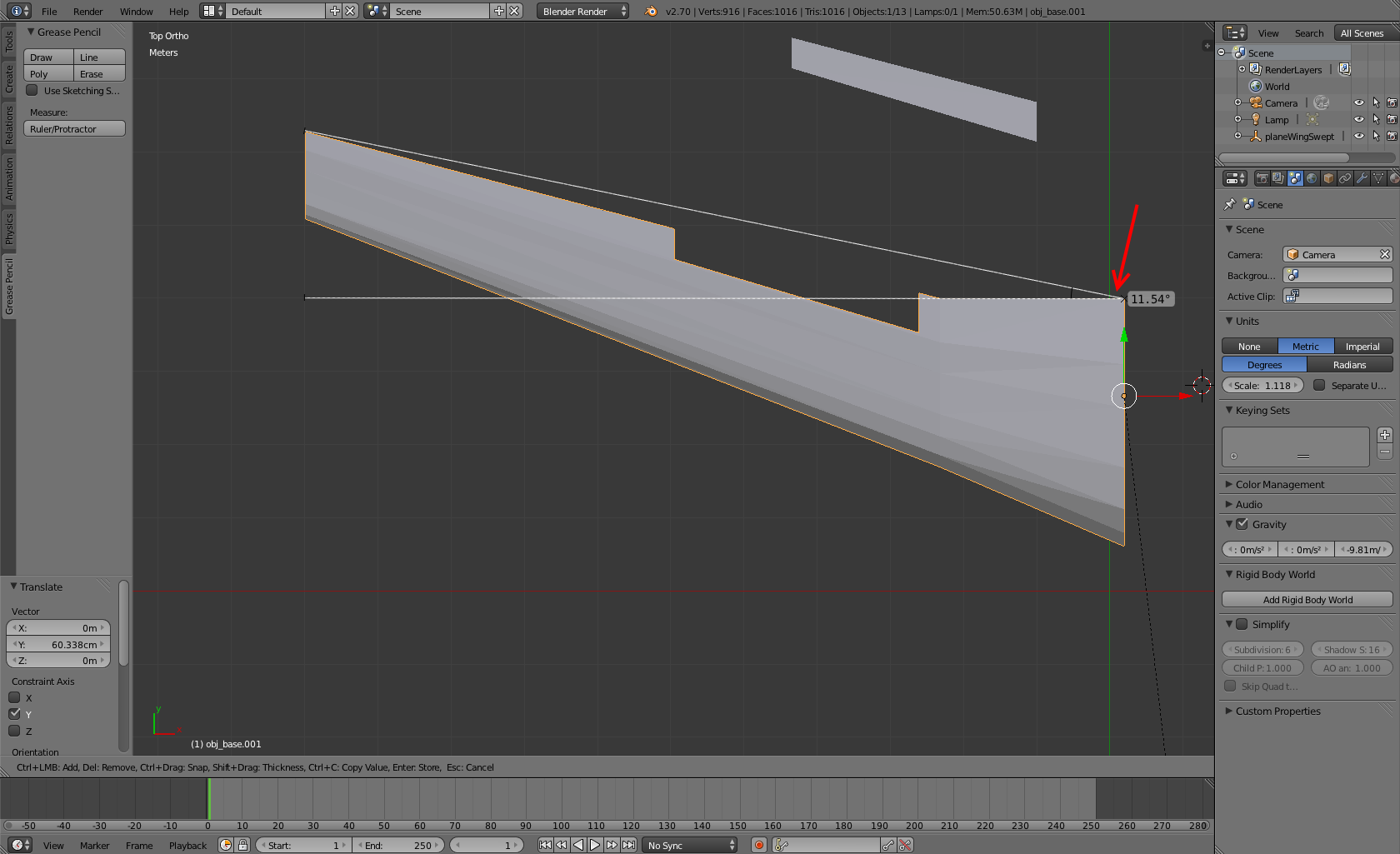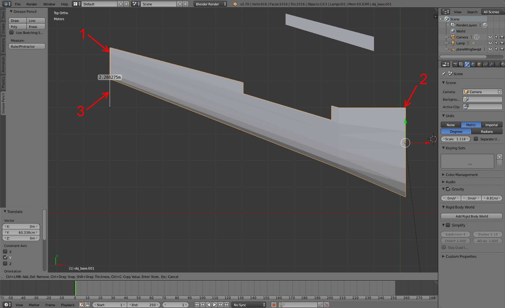 Because of the sweep, drawing a straight line from Root to Tip is difficult, but that's where the grid lines come to the rescue once again, by allowing us to align the Root (1) and then drawing a ruler from the Tip (2) along a horizontal grid line to the Root's vertical location.